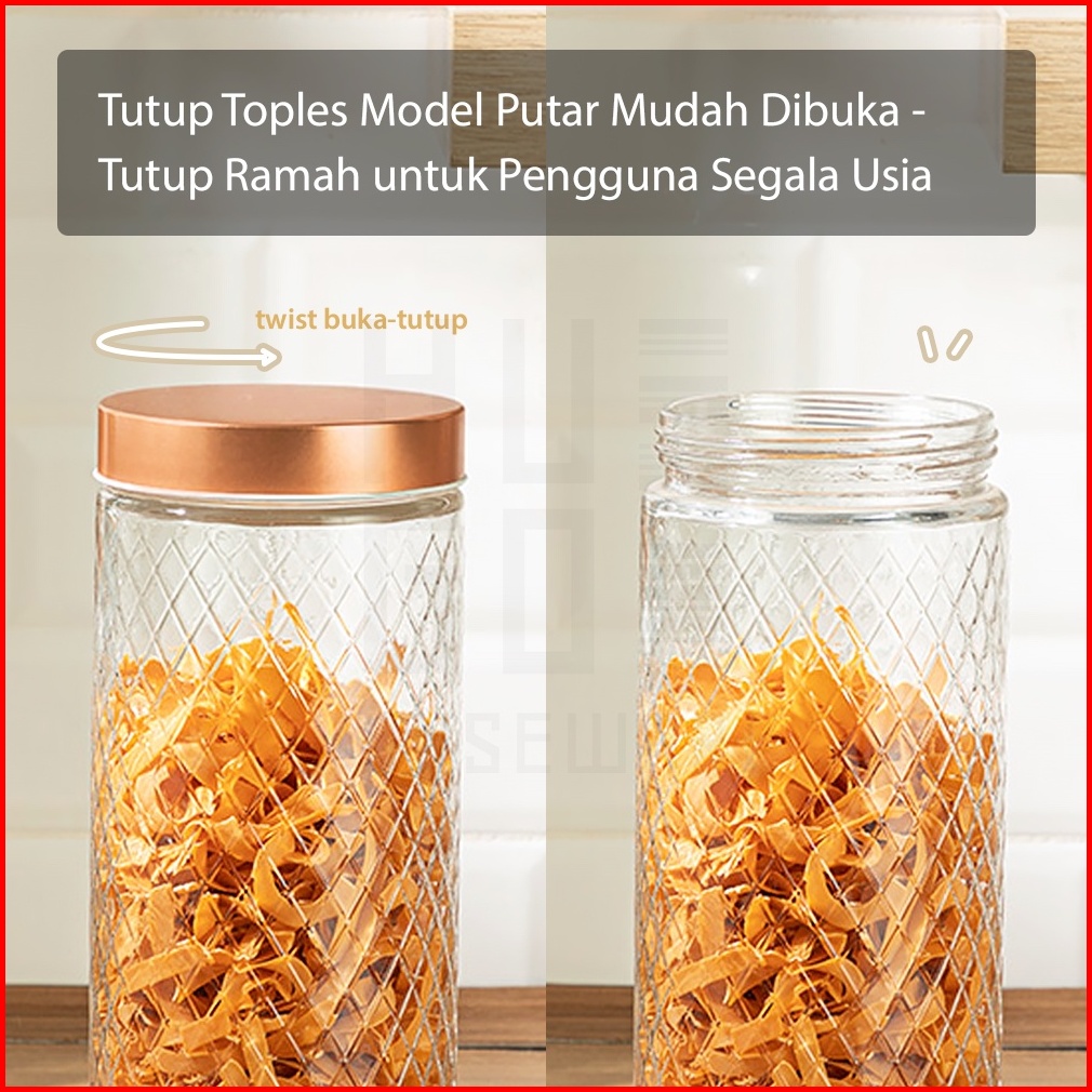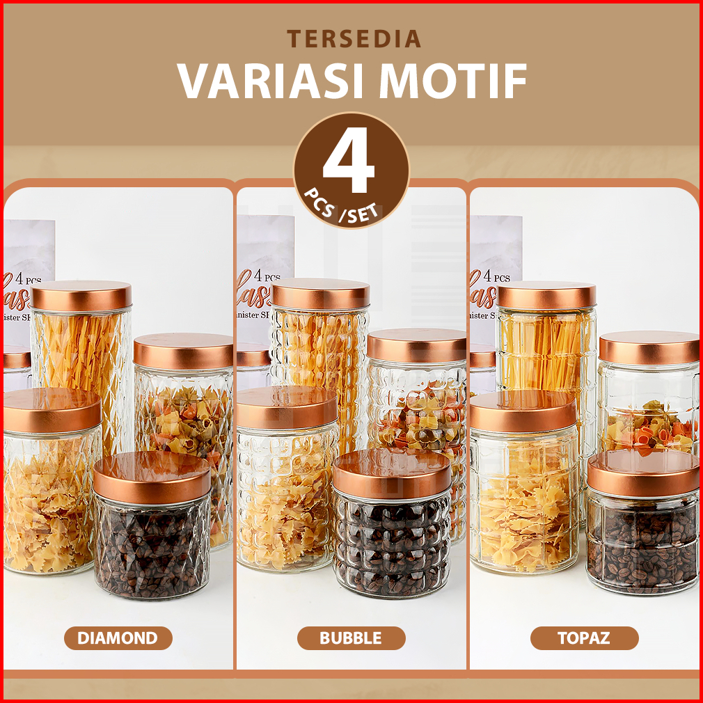 Hugo Toples Kaca Set 4 Pcs Toples Kue Kedap Udara Tutup Warna Rose Premium Quality