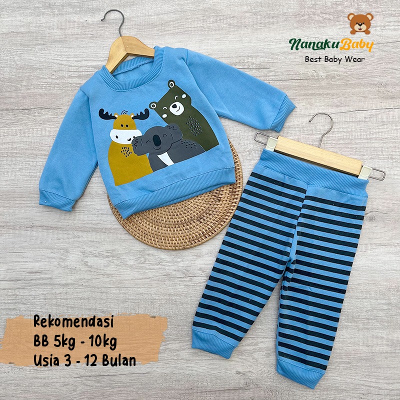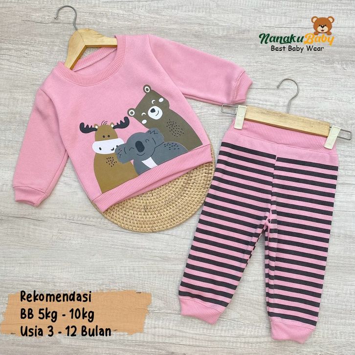 Nanaku Baby - Setelan Baju Sweater Celana Joger Bayi Bahan Katun Fleece Usia 3-12 Bulan Motif Animal