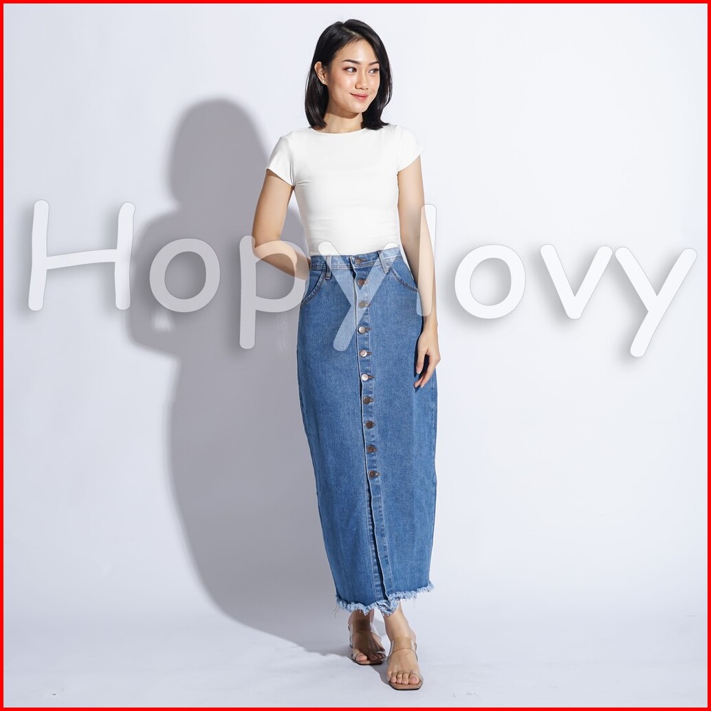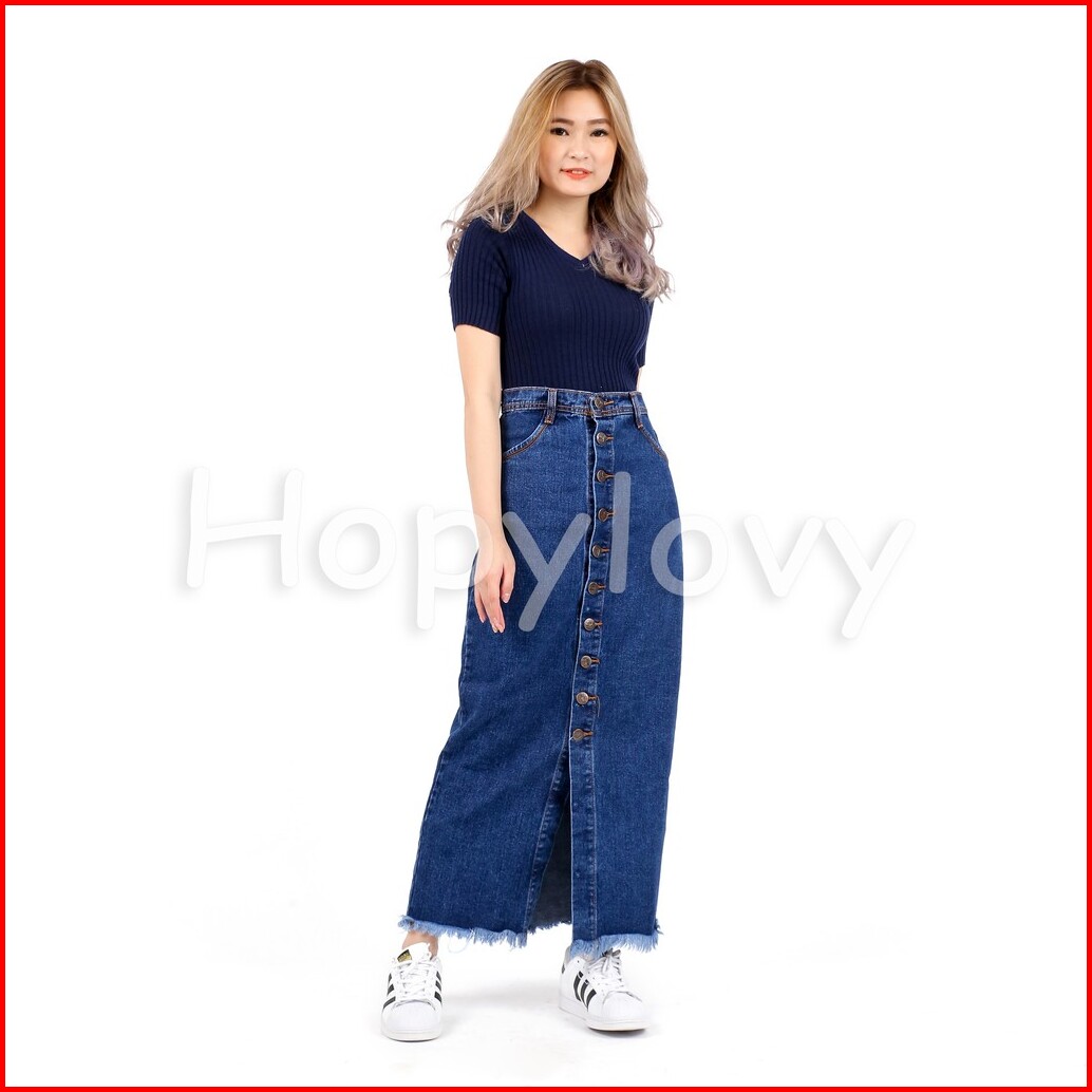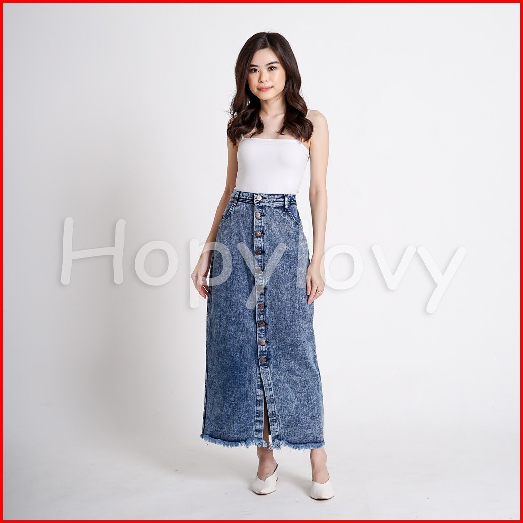 Hopylovy - Rok Jeans Panjang Wanita Kancing Depan Belah Front Slit Caca