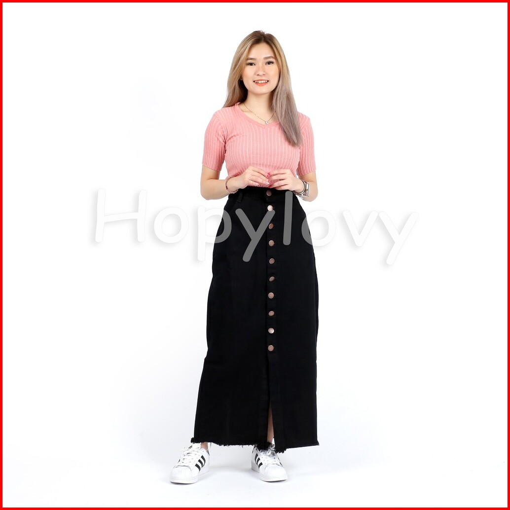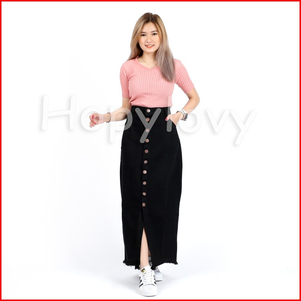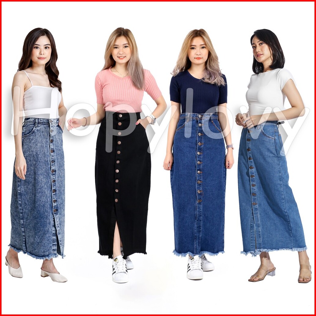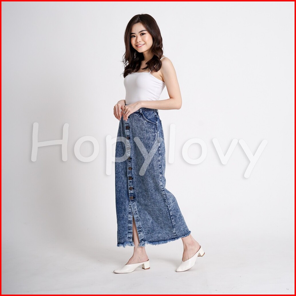 Hopylovy - Rok Jeans Panjang Wanita Kancing Depan Belah Front Slit Caca