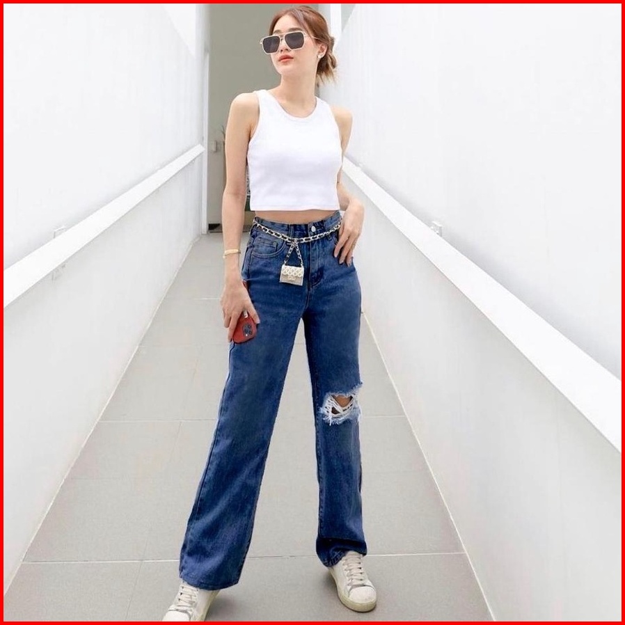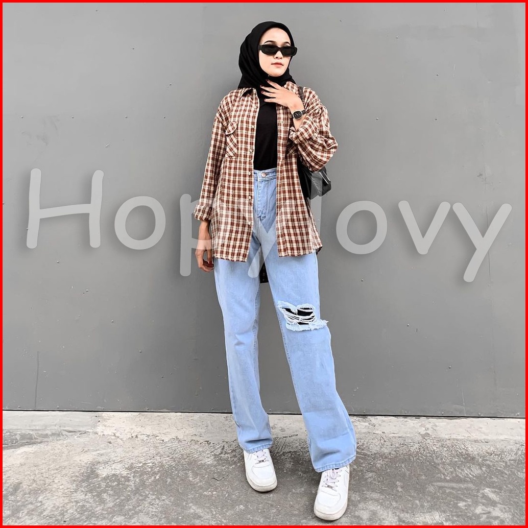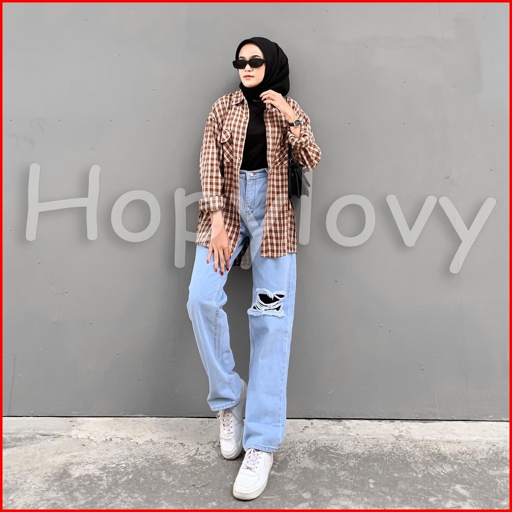 Hopylovy Celana Loose Jeans Highwaist Wanita Celana Kulot Jeans High Waist Celana Jeans Sobek Long Bf Ishika Loose Jeans