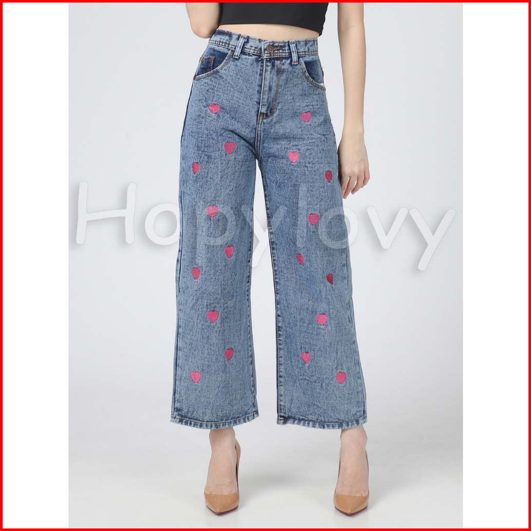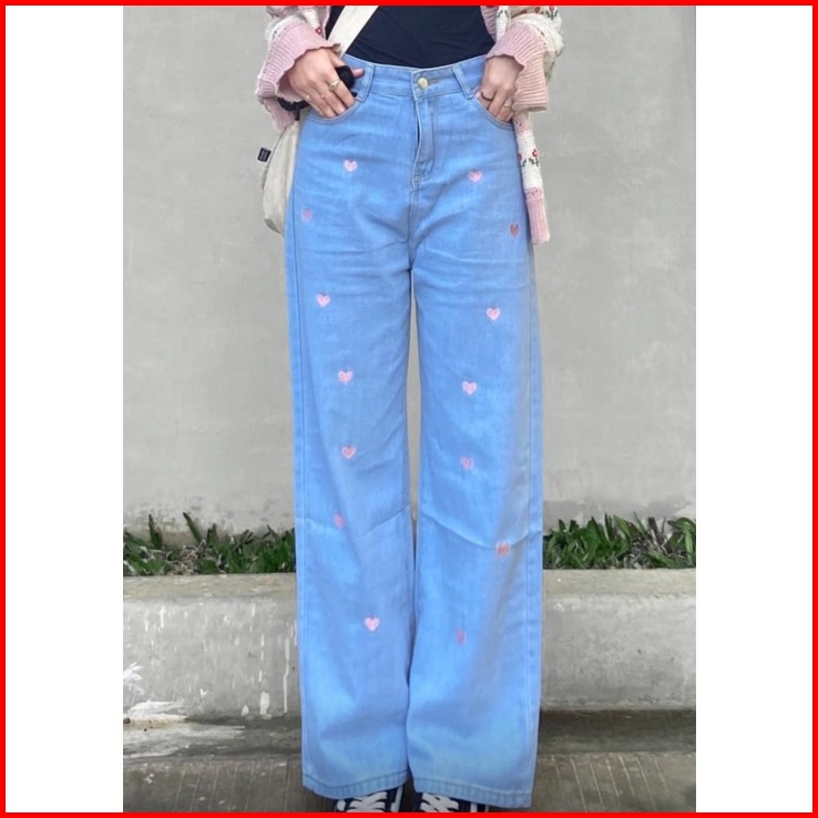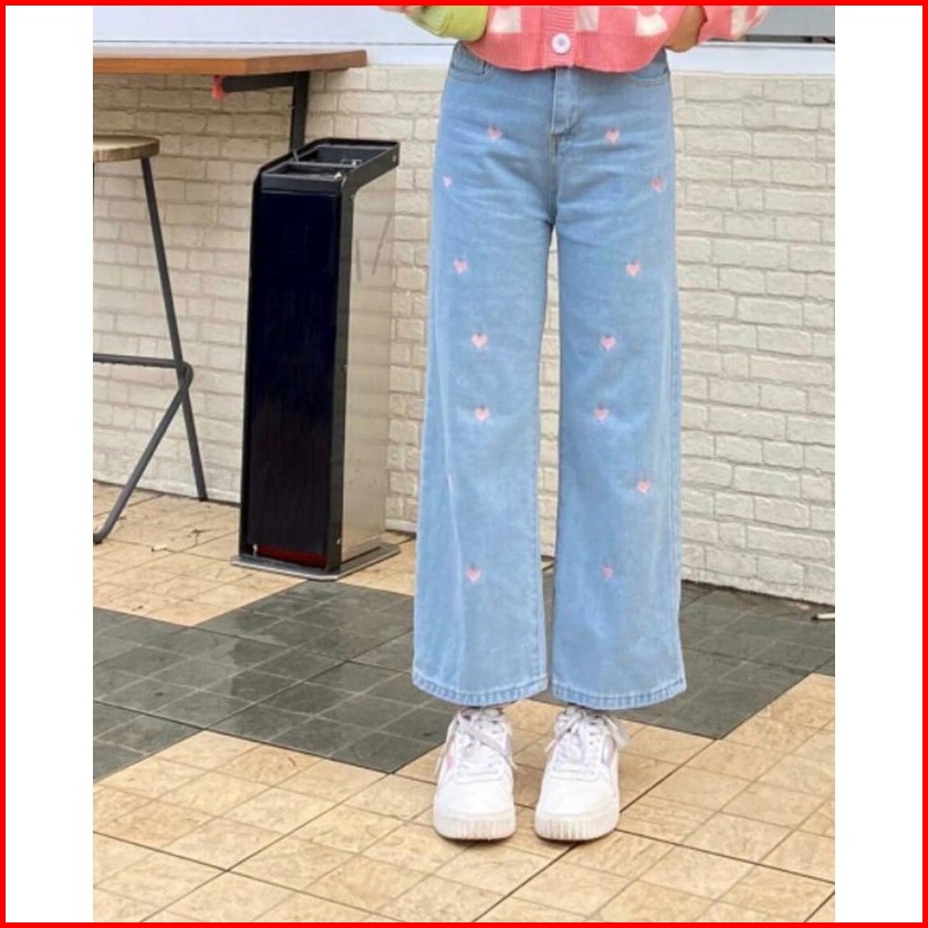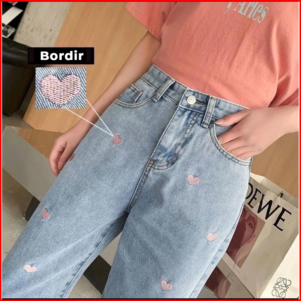 Celana Kulot Jeans Highwaist Wanita Kulot Jeans High Waist Love Bf Jeans Bordir Love Pink Zanina