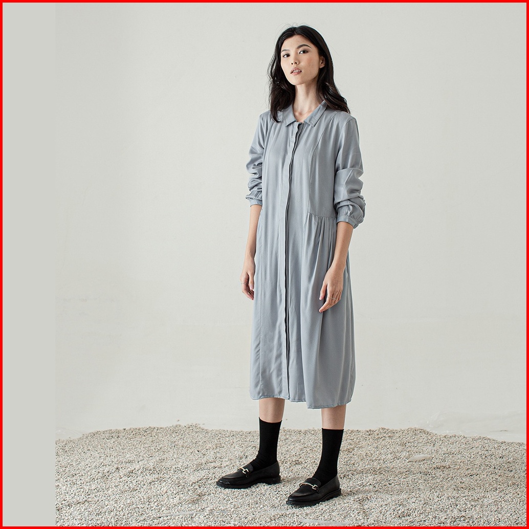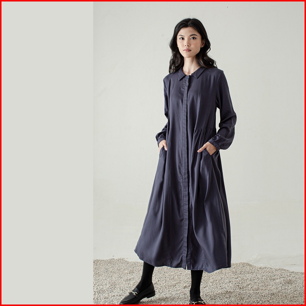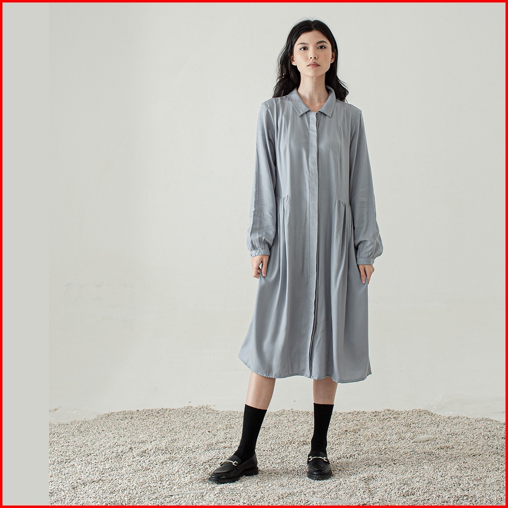 Inkano Beth - Midi Dress Wanita Bahan Rayon Lengan Panjang Full Kancing Dan Busui Friendly Warna Dusty Blue Latte Hitam