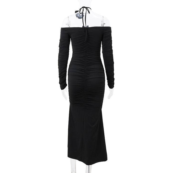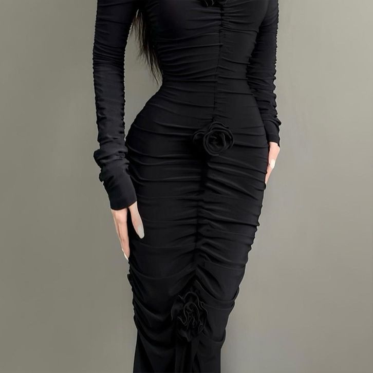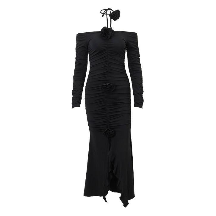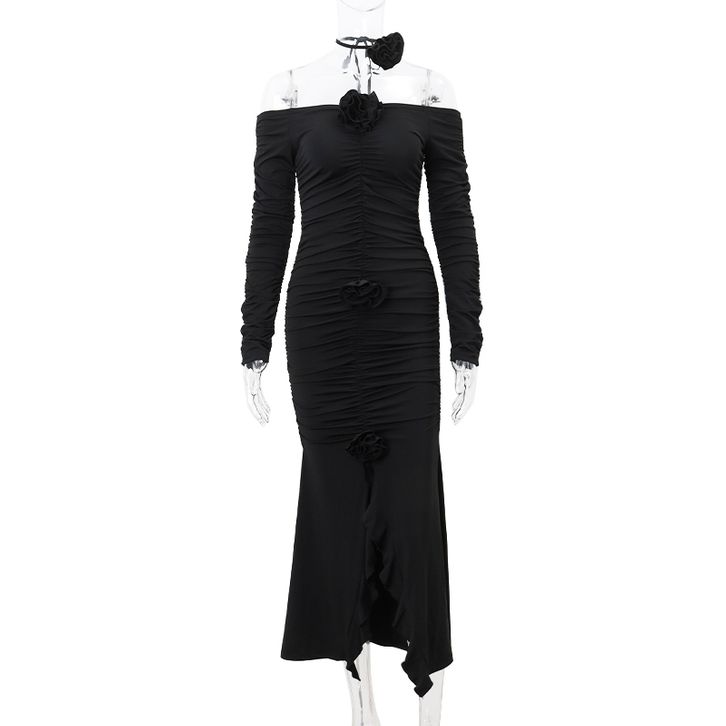 FREE ONGKIR 【Premium】Long Off Shoulder Dress With Ruched Flowers 3097 (S/M/L) Dres Pesta Baju Party Gaun Party OOTD