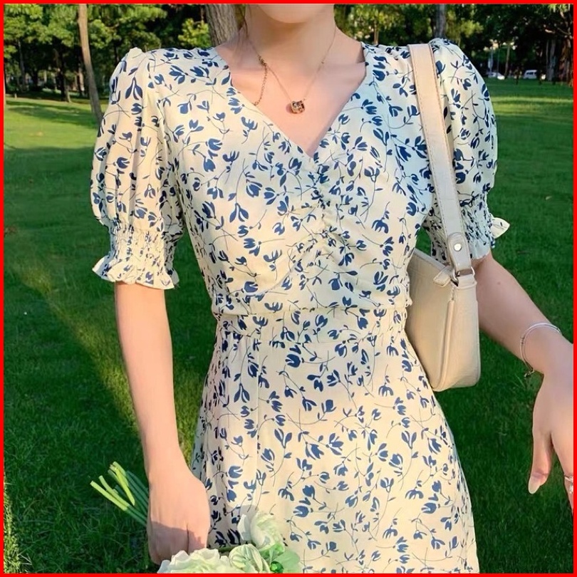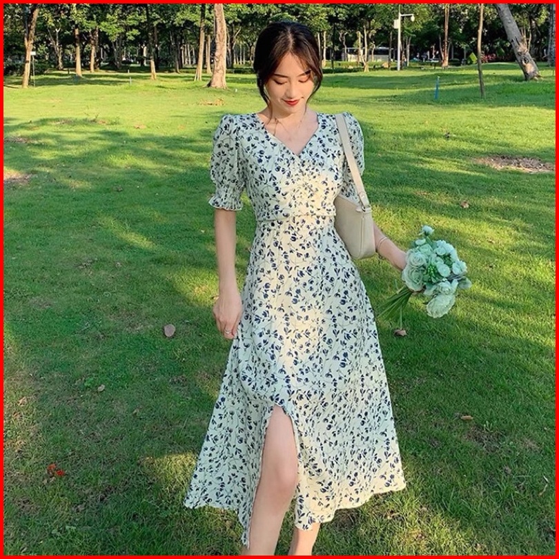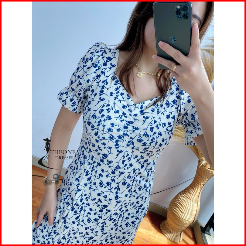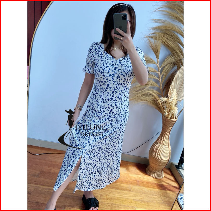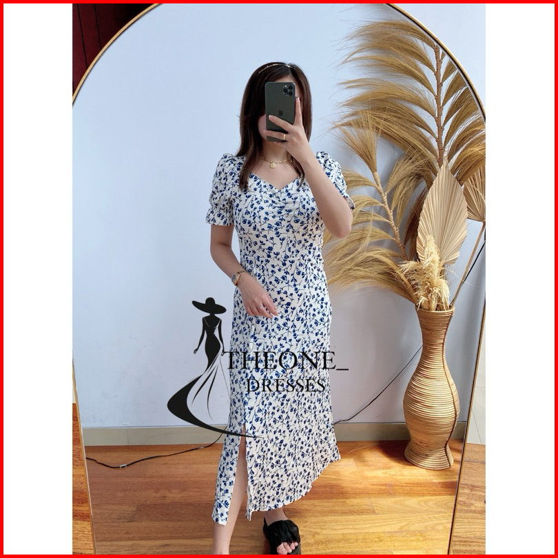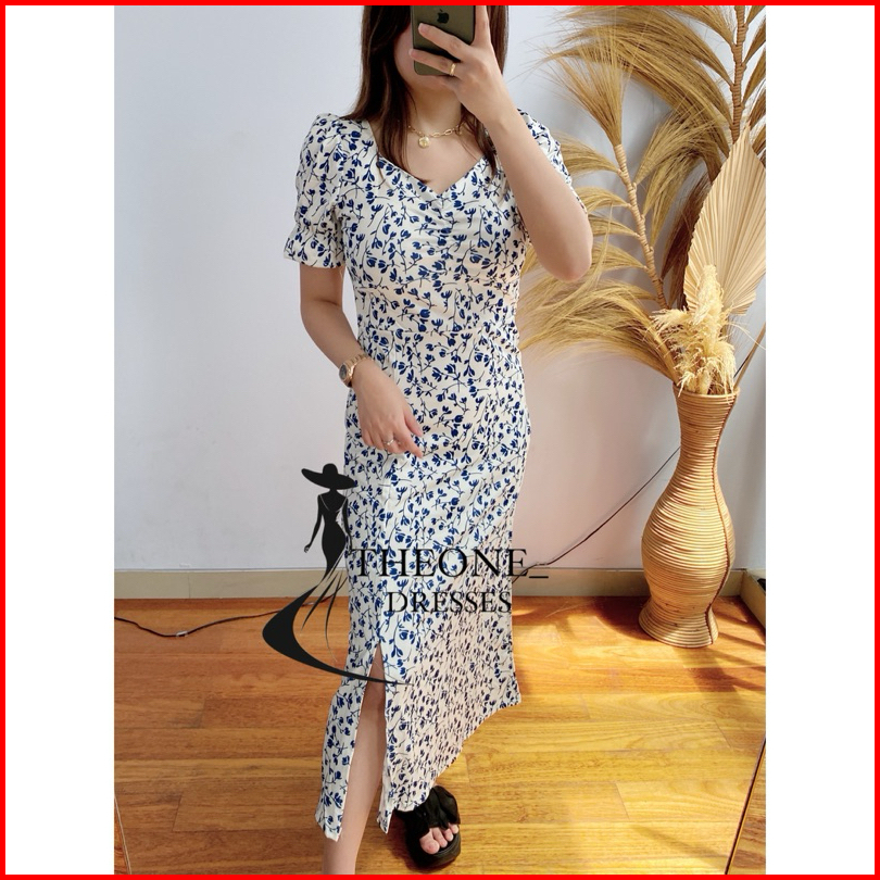 Theone Floral Midi Dress Import S M L Xl Xxl - Broken White Flower Slit Dress Cream Blue
