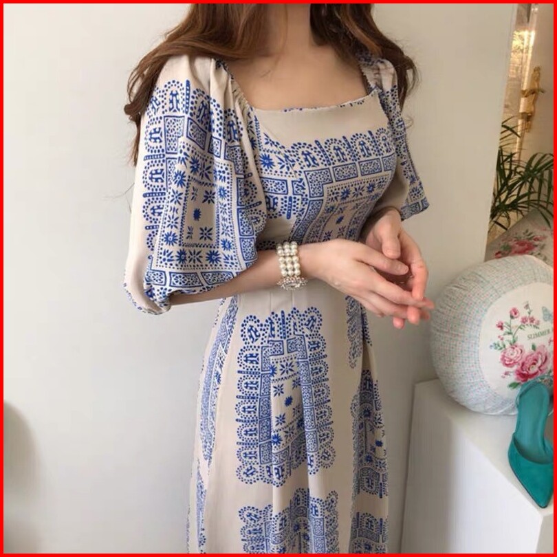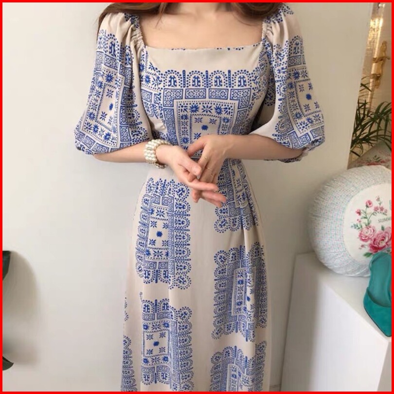 Theone Dress Wanita Import Model Lengan Puff Motif Batik Printing