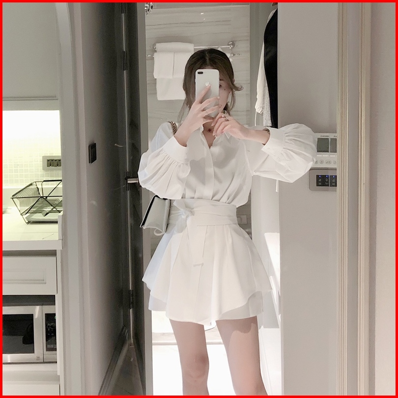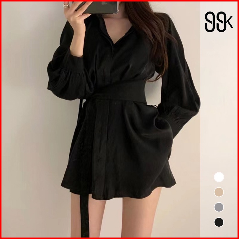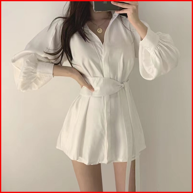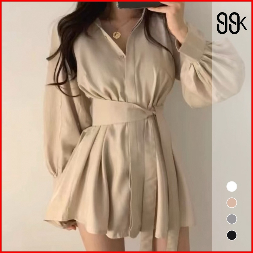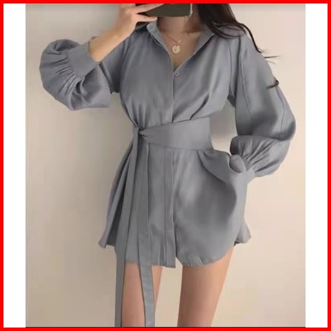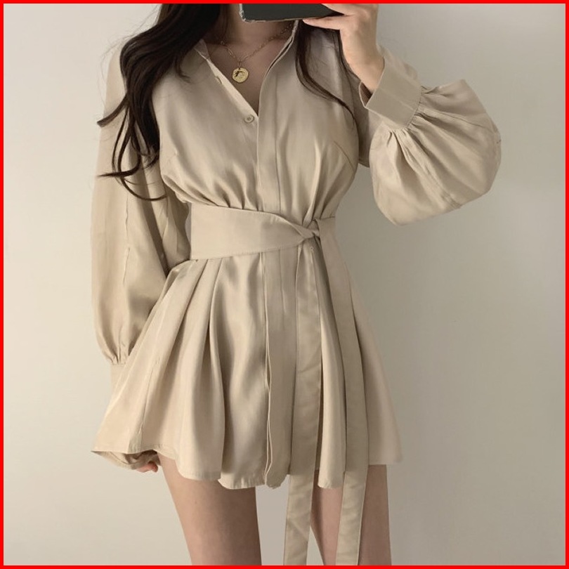Long Puff Sleeve A Line Button Front Tie Shirt Dress 1456 S-xl