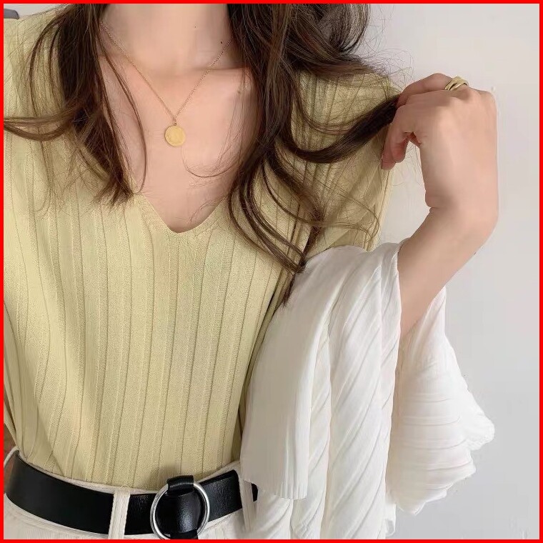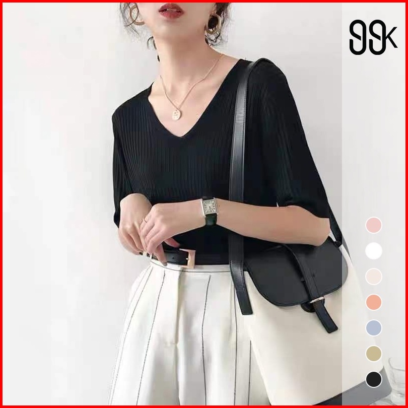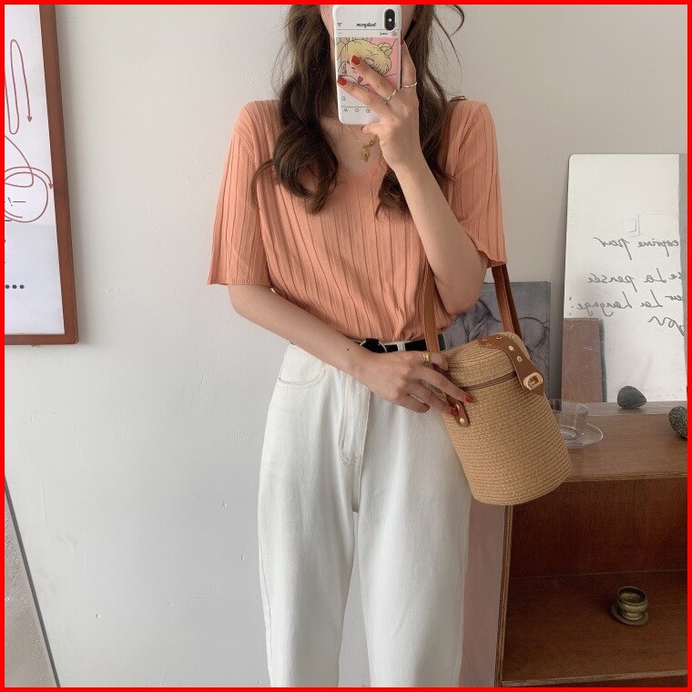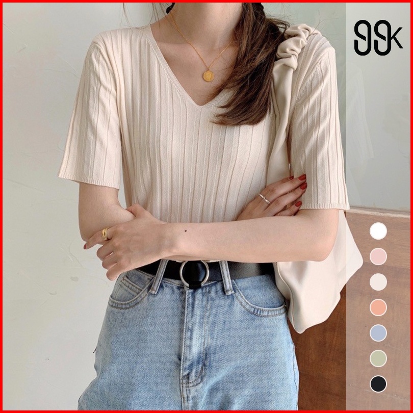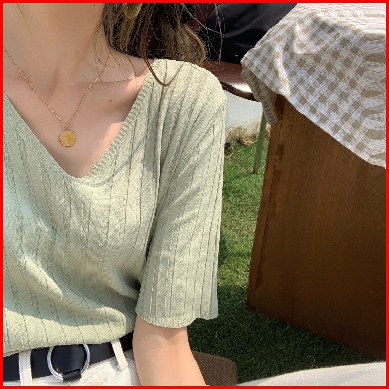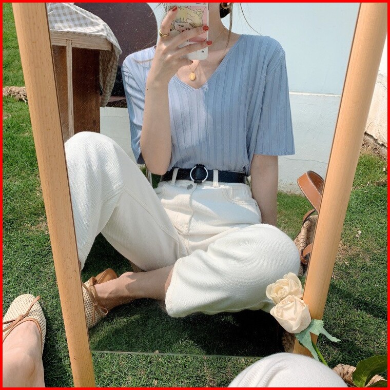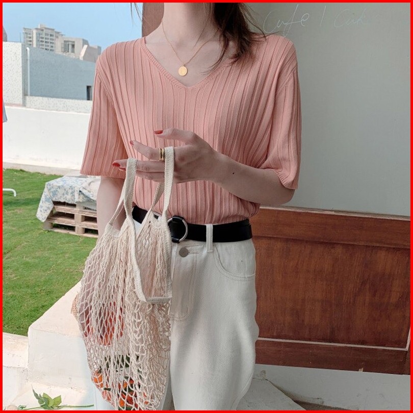 Women S V-neck Short Sleeve Knit T-shirt 2168