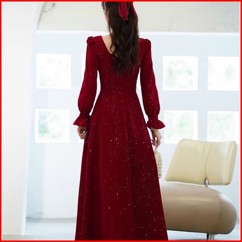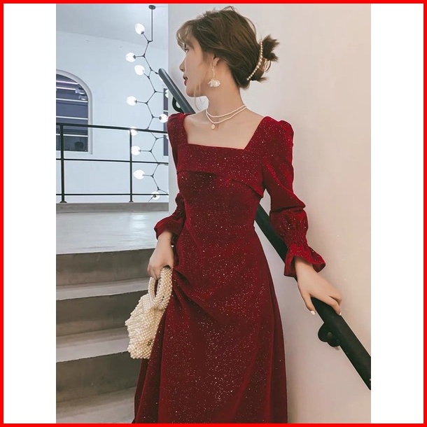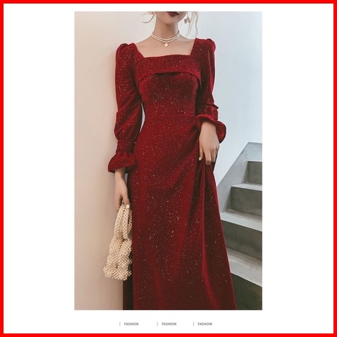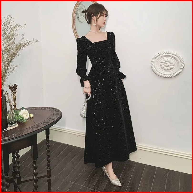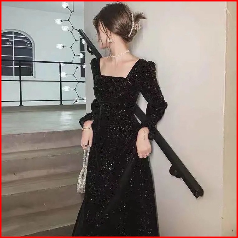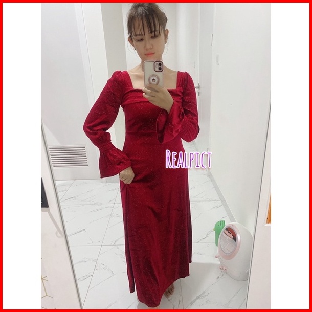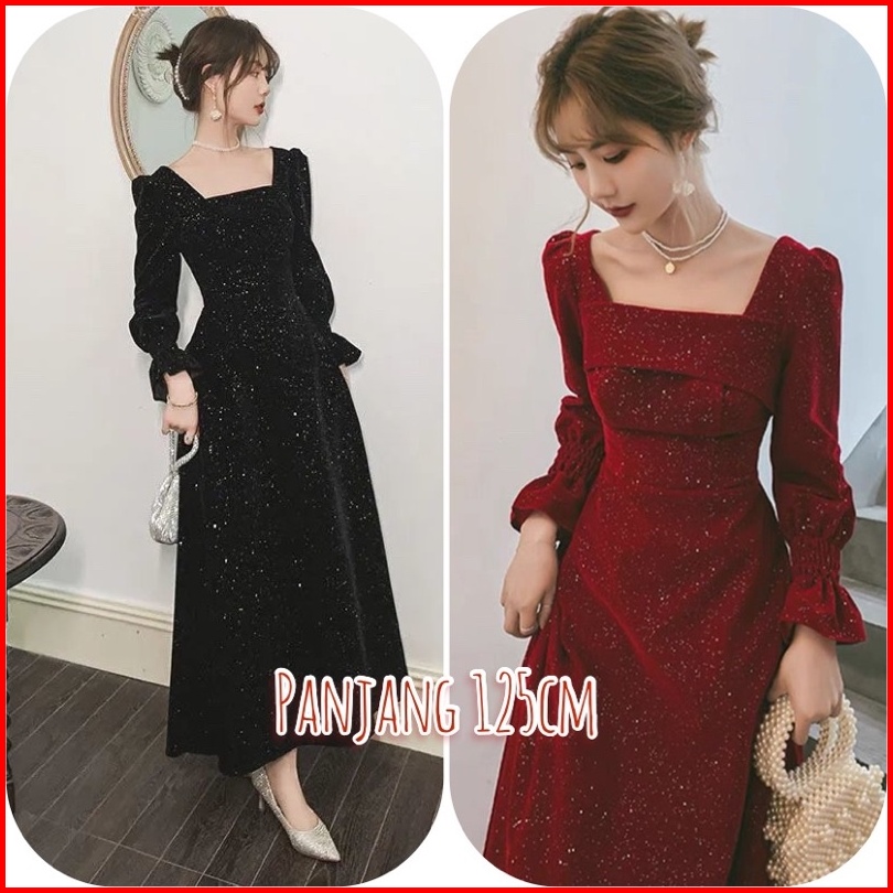 D28 25 Long Dress Velvet Square Neck Long Sleeve Blink Gaun Panjang Beludru Lengan Panjang Leher Kotak Dress Hijab Frien