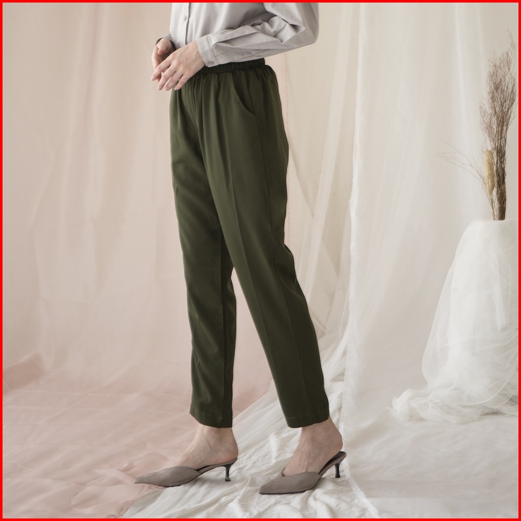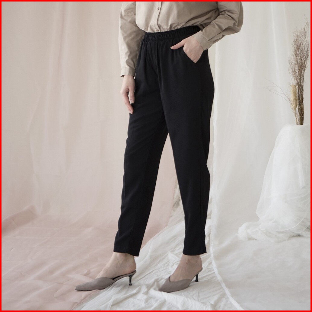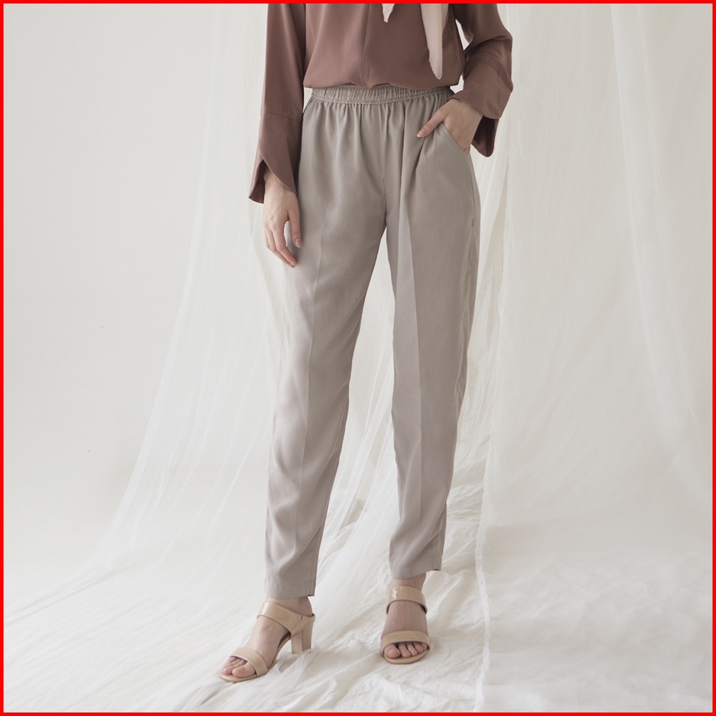Rahma By Aska Label - Celana Panjang Wanita Lurus Pinggang Karet Warna Hitam Light Grey Olive Sand