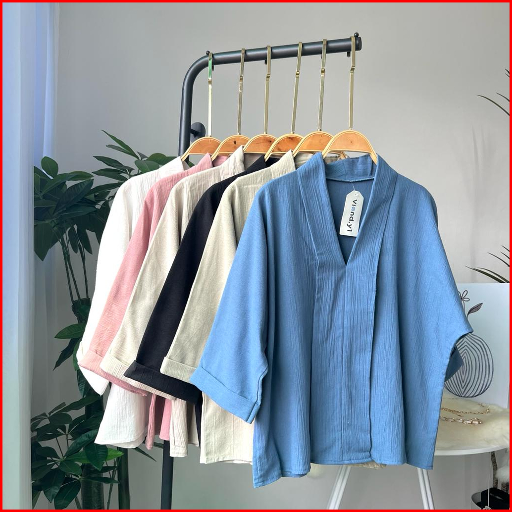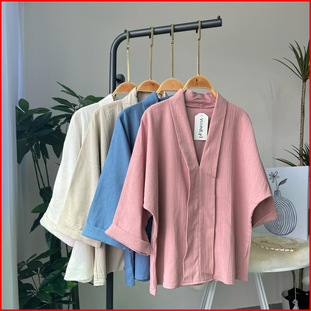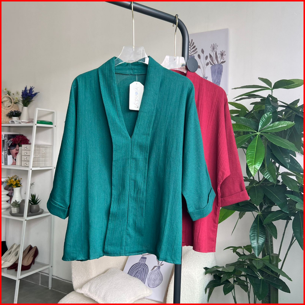 Blouse Korea V Neck Casual Blouse Wanita Kringkel Linen E12