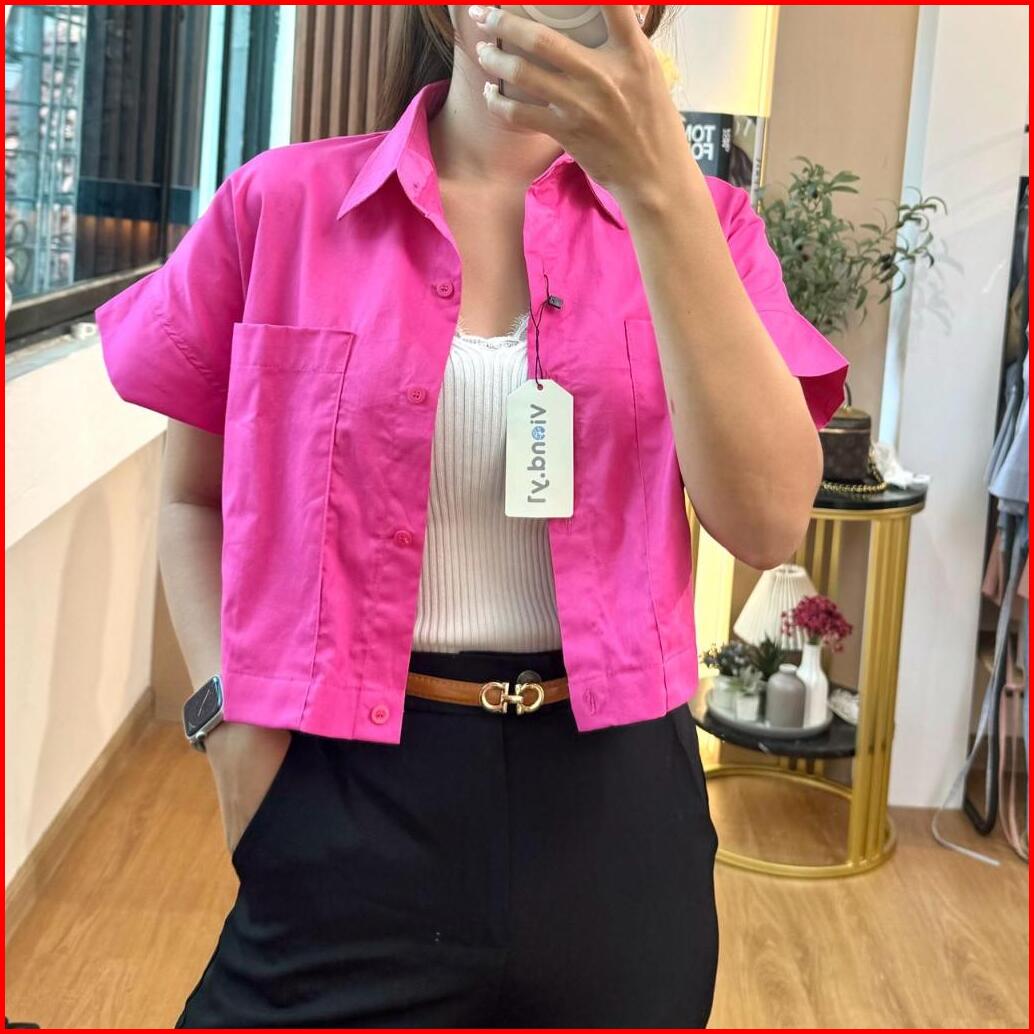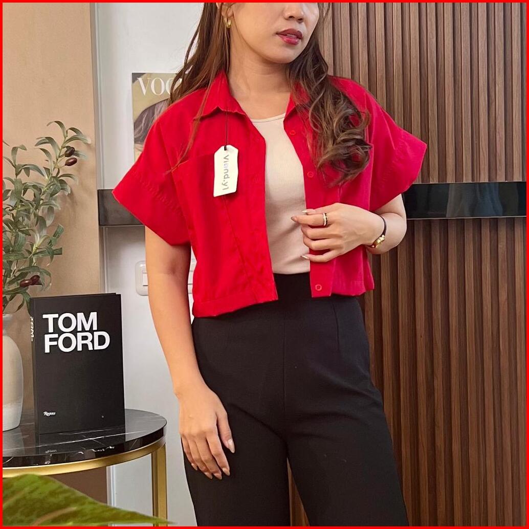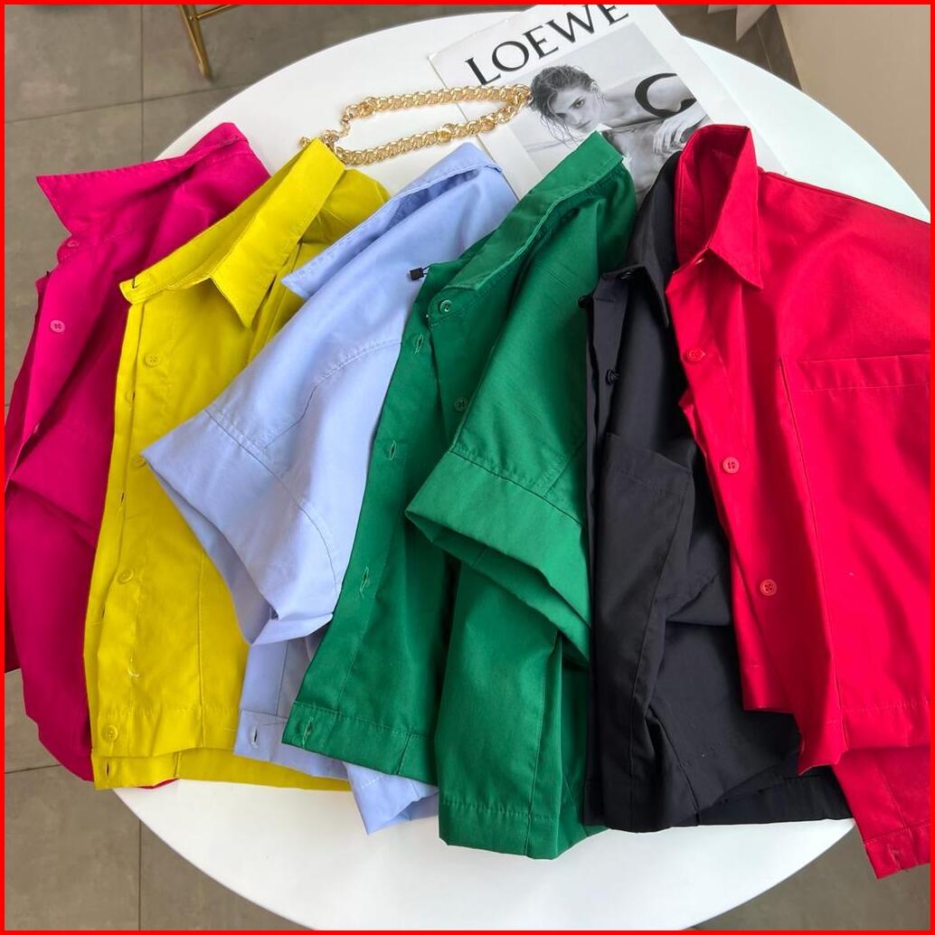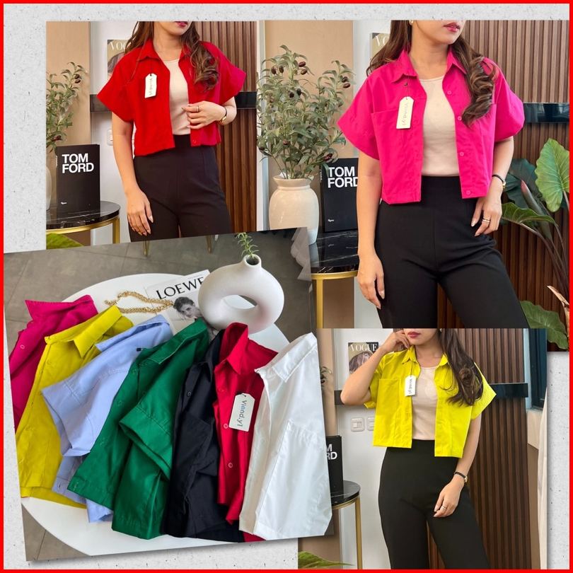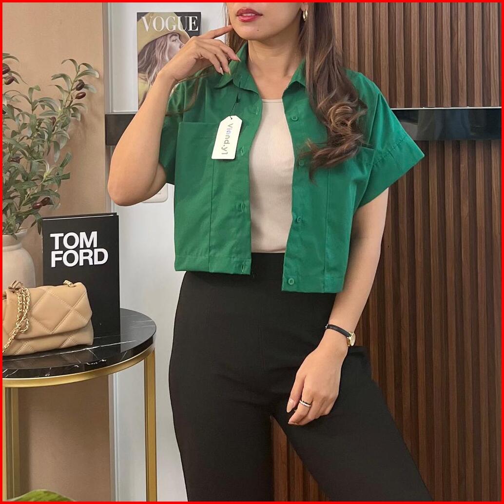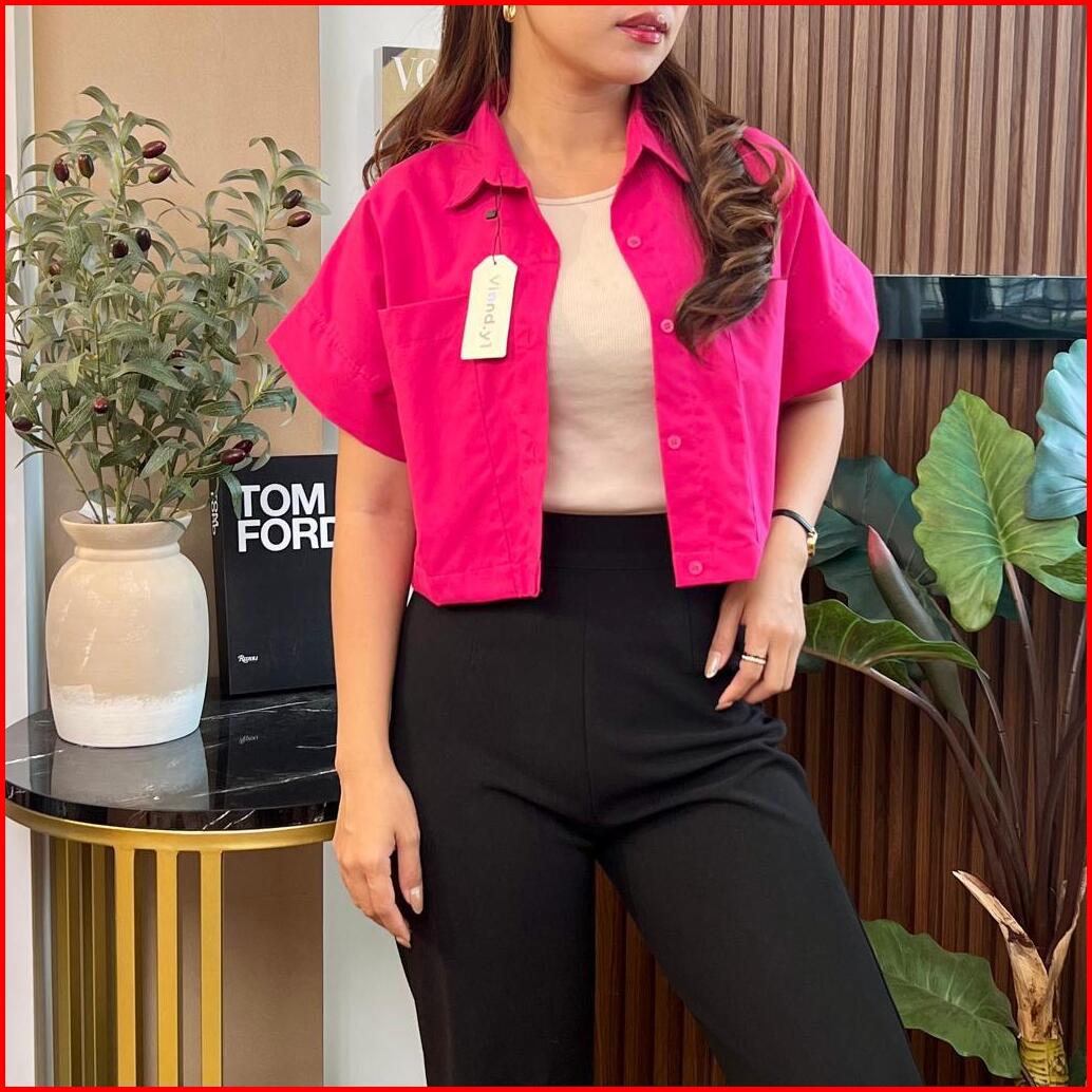 Kemeja Lengan Pendek Kemeja Basic Crop Style Blouse Wanita Korea Katun Poplin Premium E.94