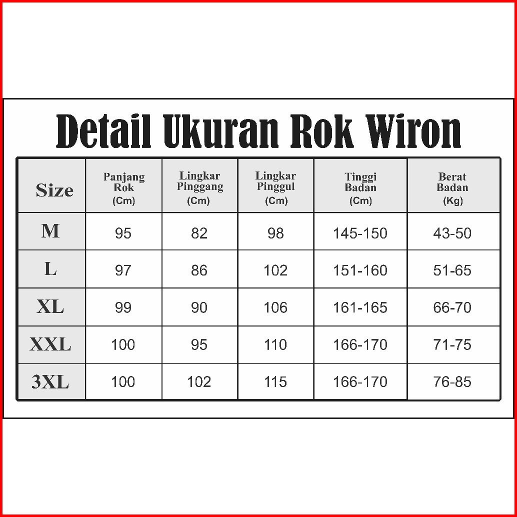 Jumputan standar M, Jumputan Standar L, Jumputan Standar XL, Jumputan Standar XXL, Jumputan Standar 3XL, Jumputan Standar 4XL