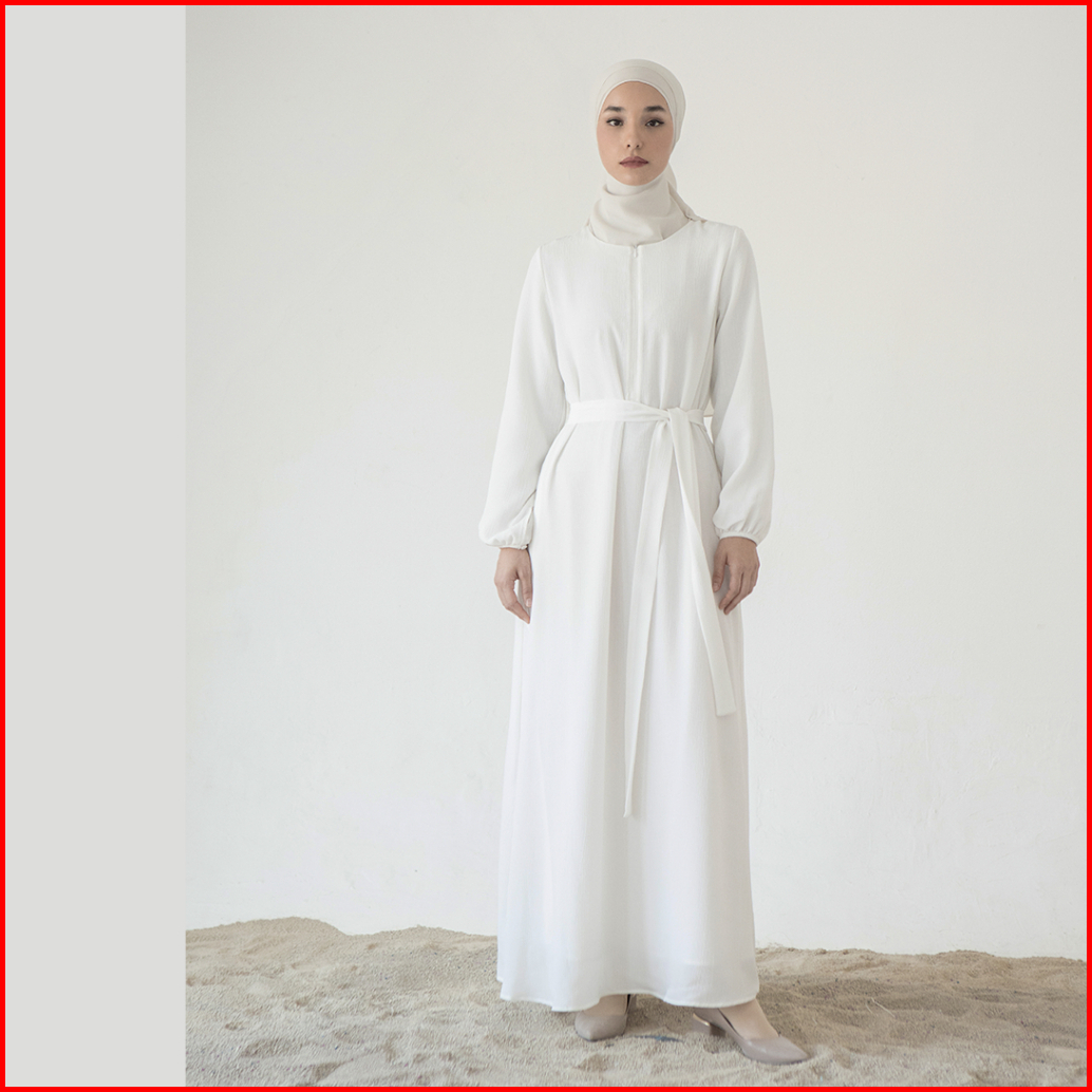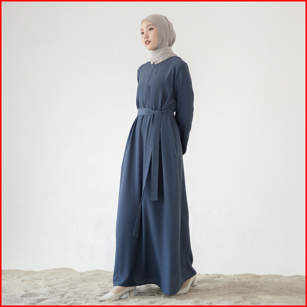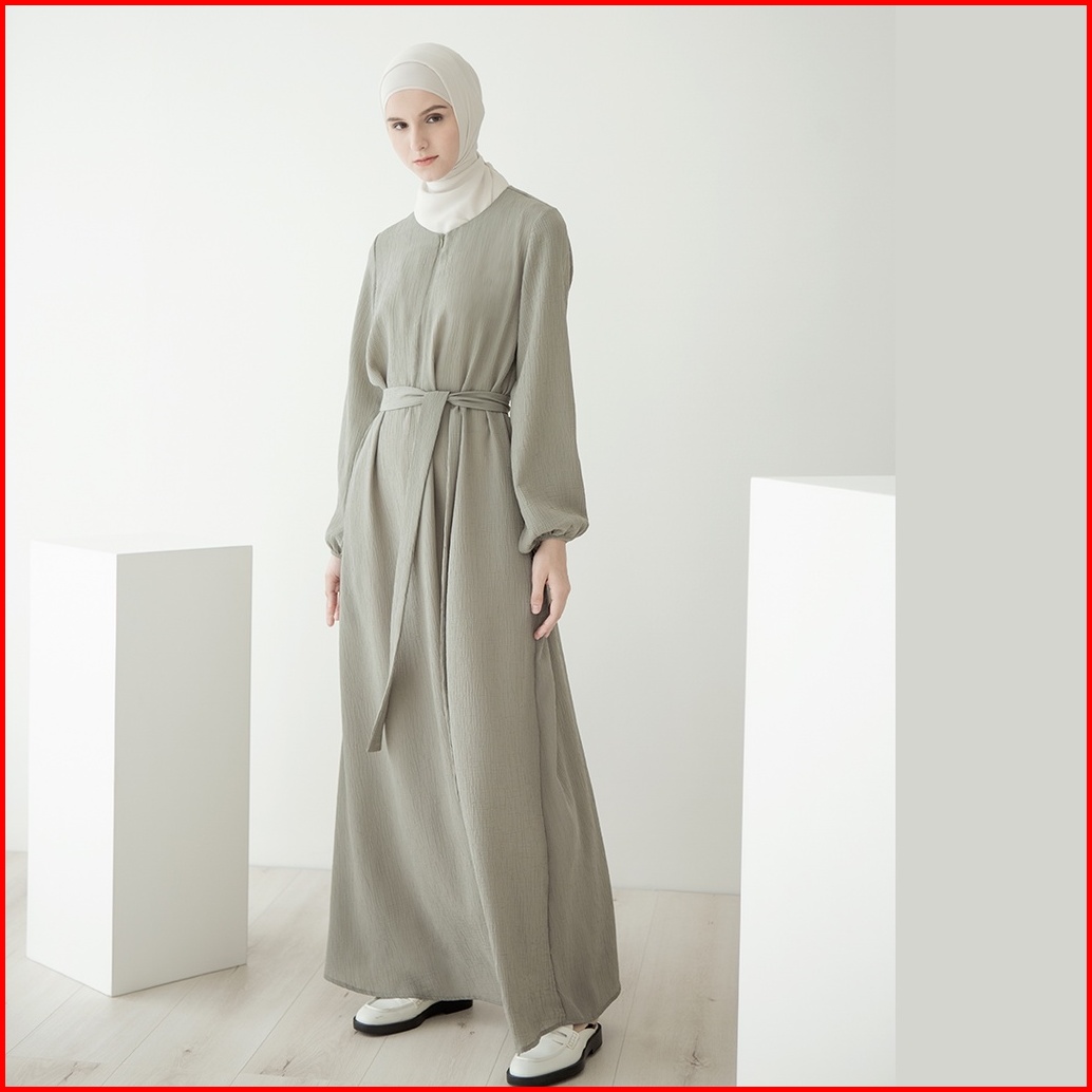 Svasti By Aska Label - Gamis Wanita Polos Bahan Crinkle Dress Wanita Muslim Lengan Panjang Ikat Pinggang Warna Beige Hij
