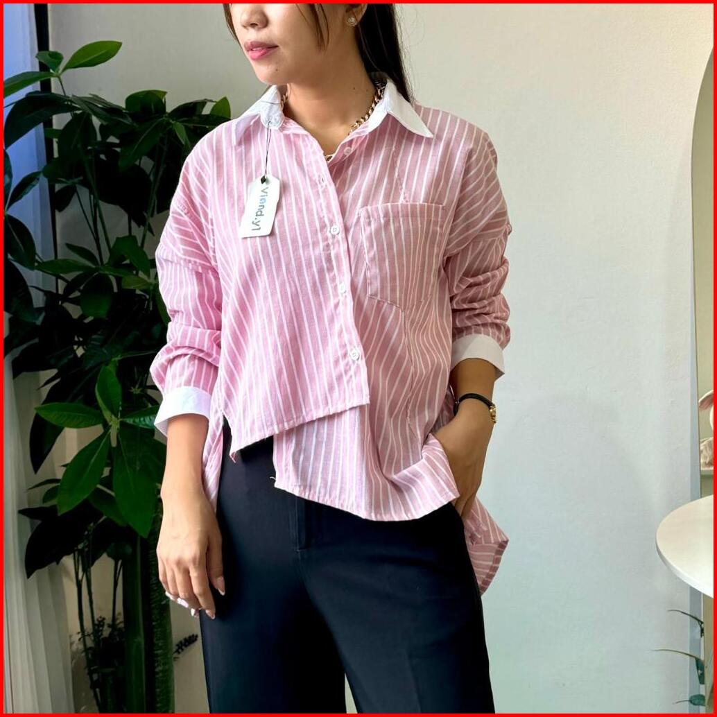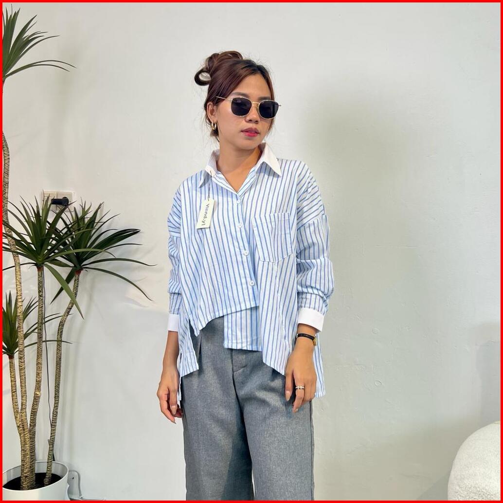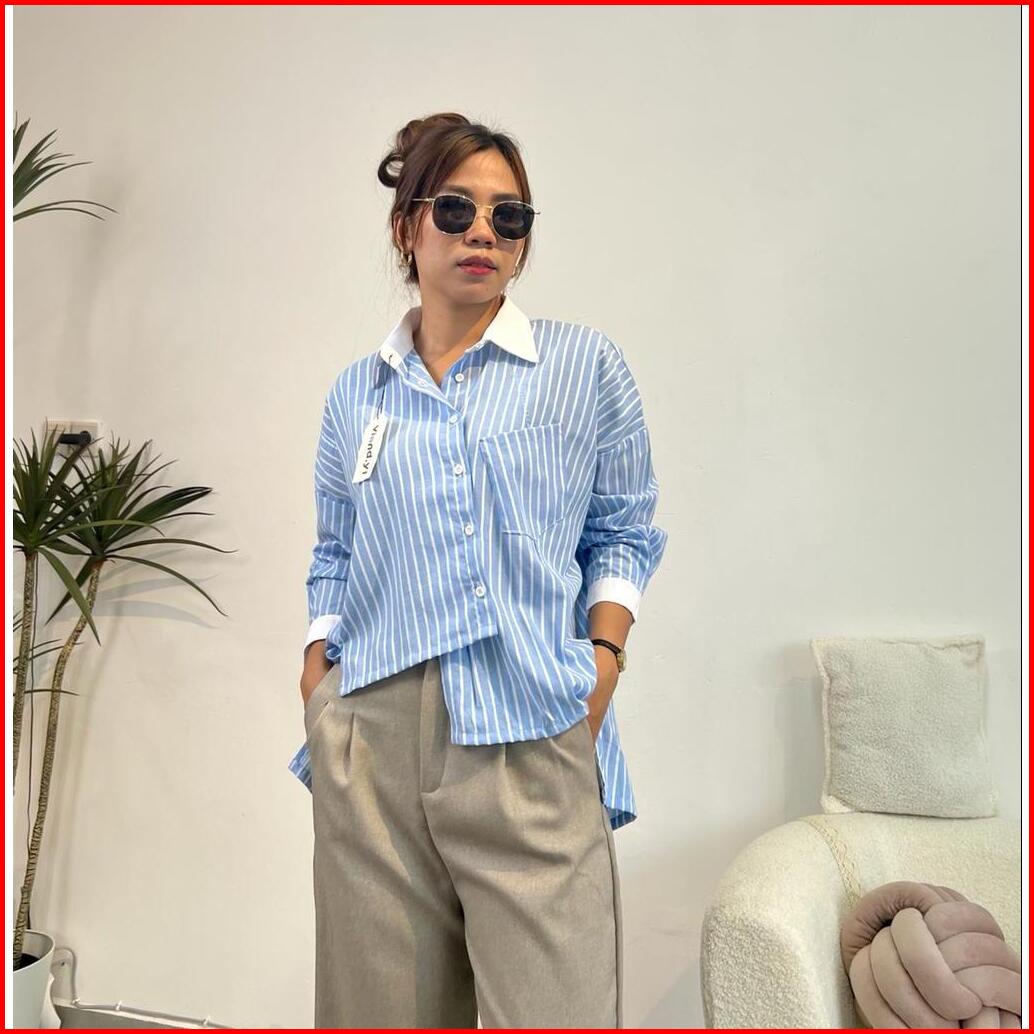 Kemeja Salur Kombinasi Wanita Long Sleeve Top Garis Atasan Korean Style E.79
