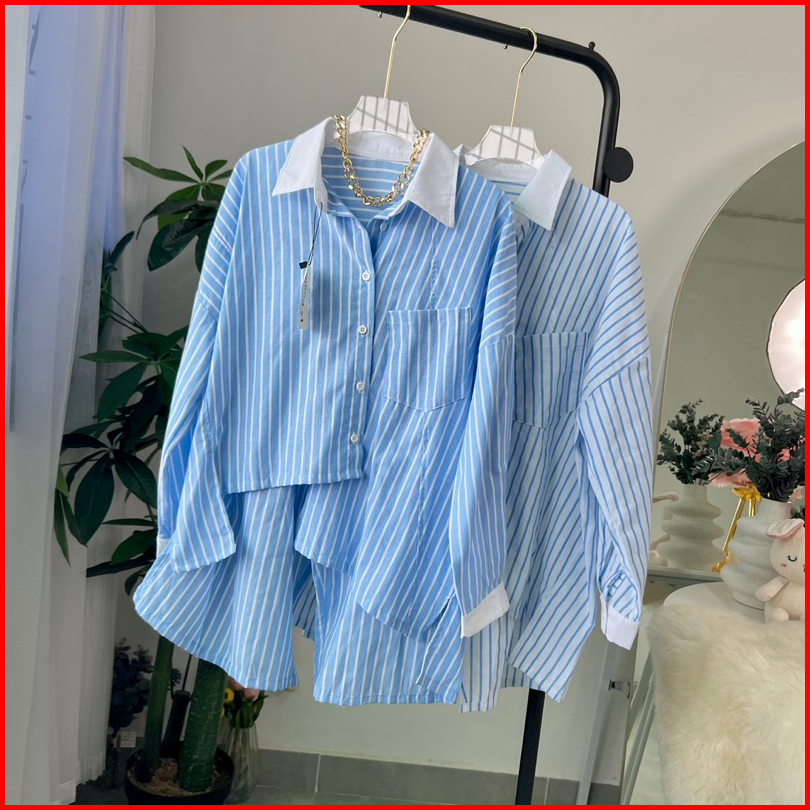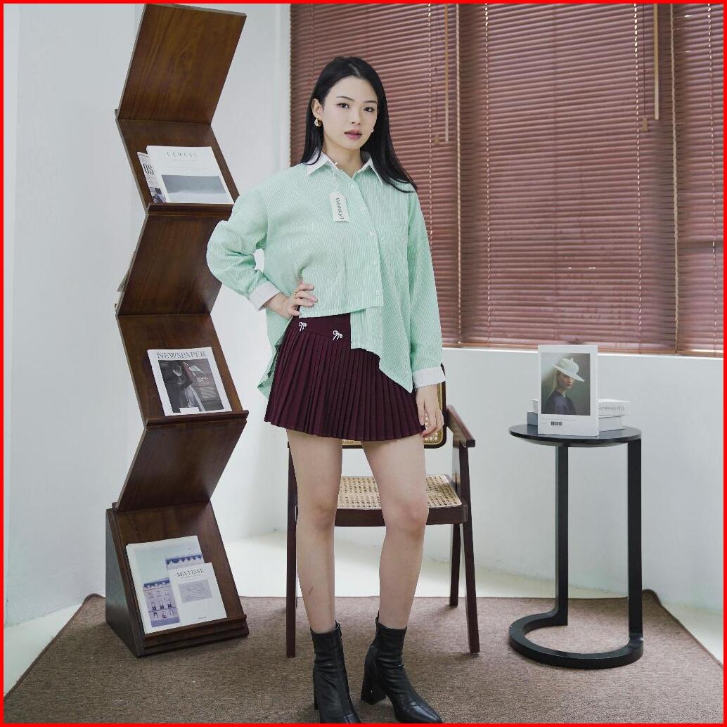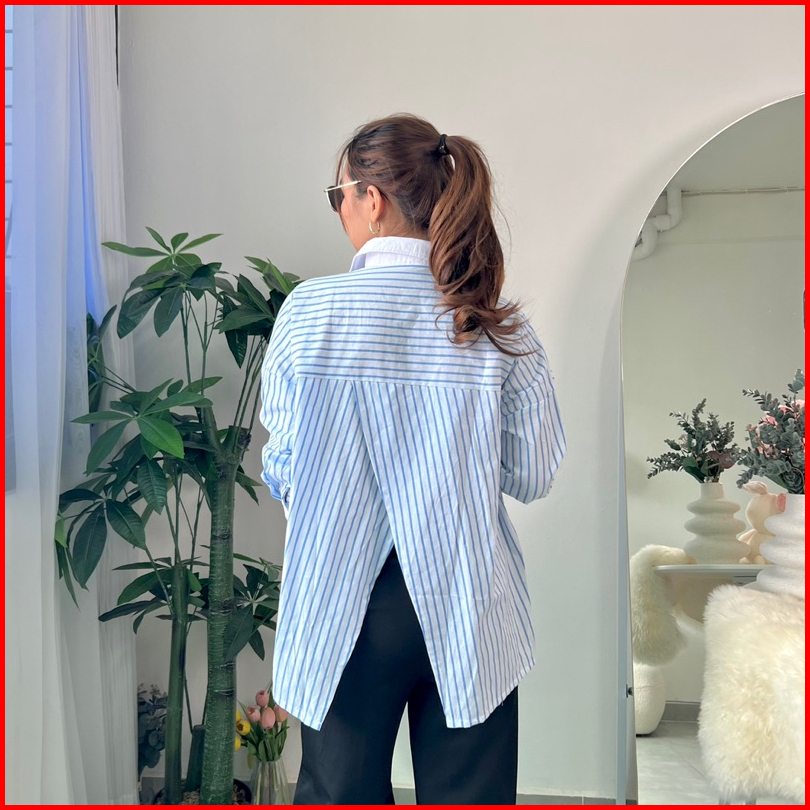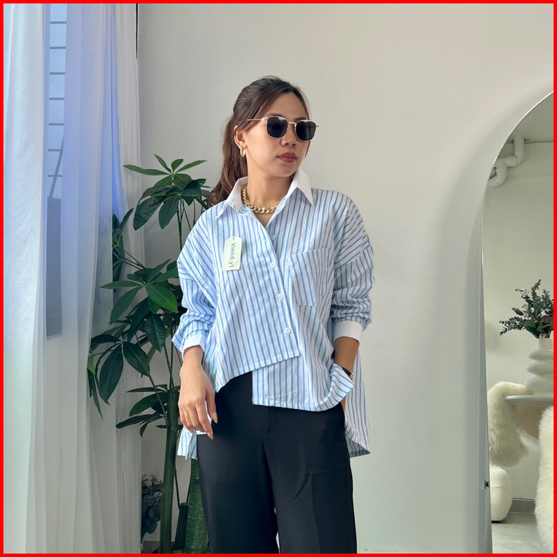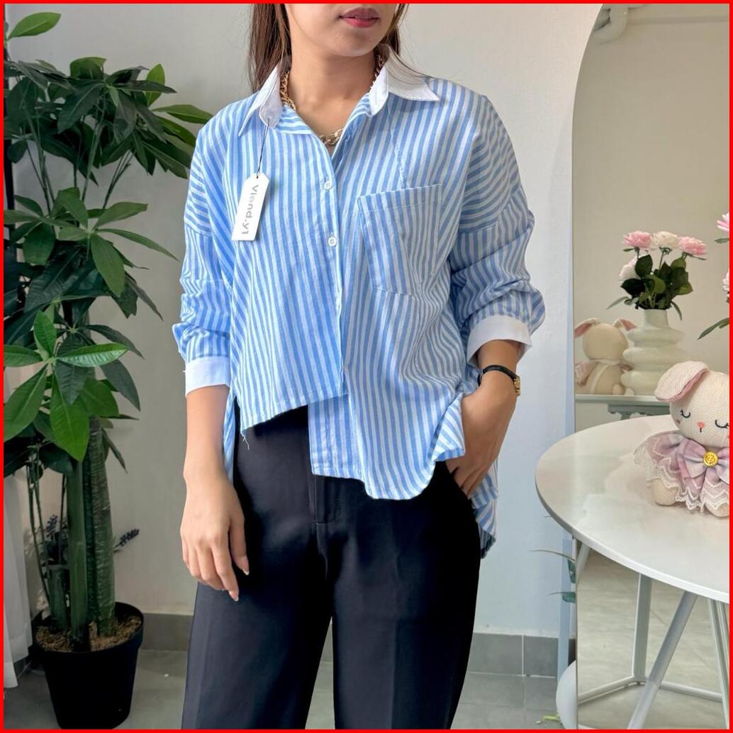Kemeja Salur Kombinasi Wanita Long Sleeve Top Garis Atasan Korean Style E.79