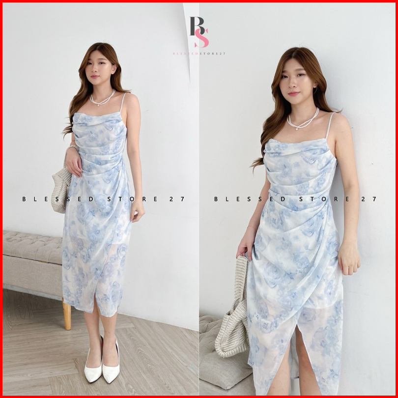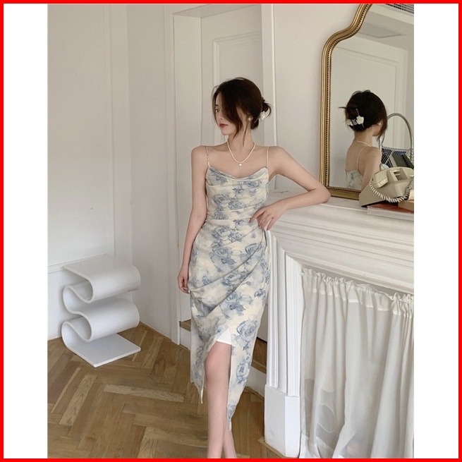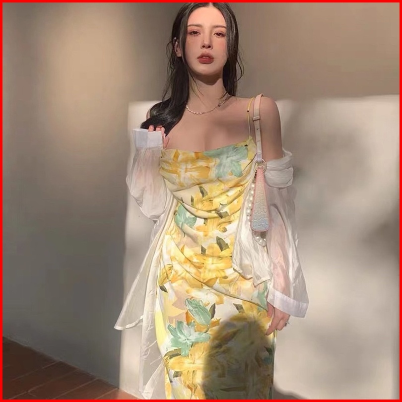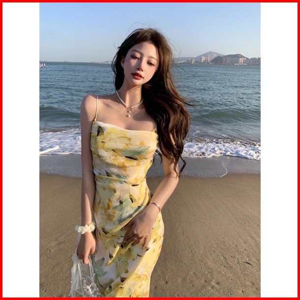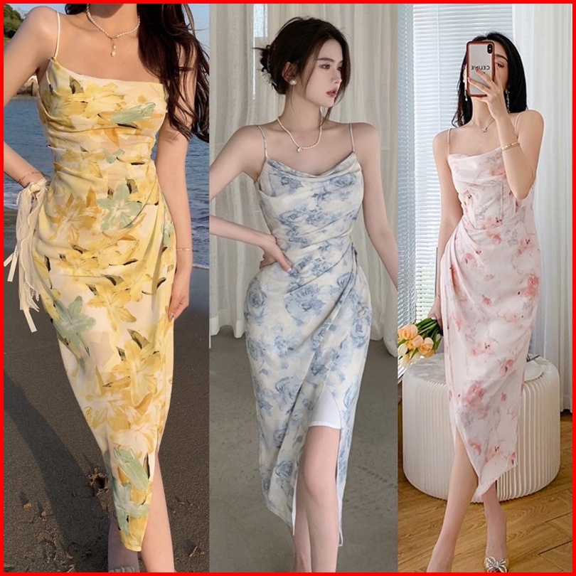 Ada 3 Ukuran D1059 Feodora Korean Style Floral Vintage Midi Dress Span Bodycon Sexy Spageti Tali Pantai Pesta Summer Bal