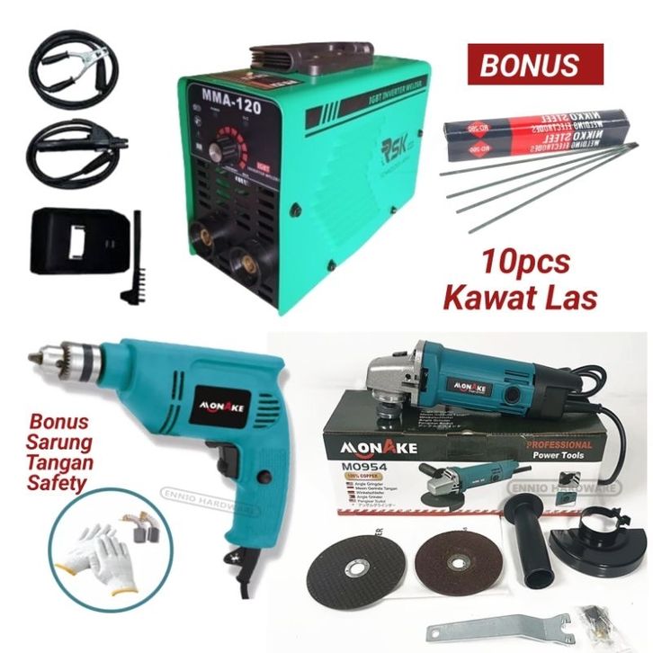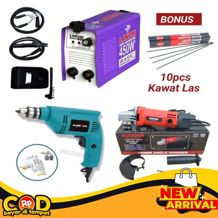 PAKET HEMAT MESIN LAS 450 WATT LAKONI BASIC + GERINDA KUSUKA + BOR LISTRIK MONAKE + KAWAT LAS 10PCS