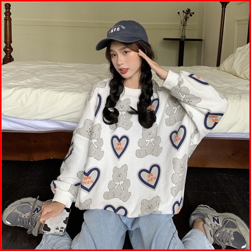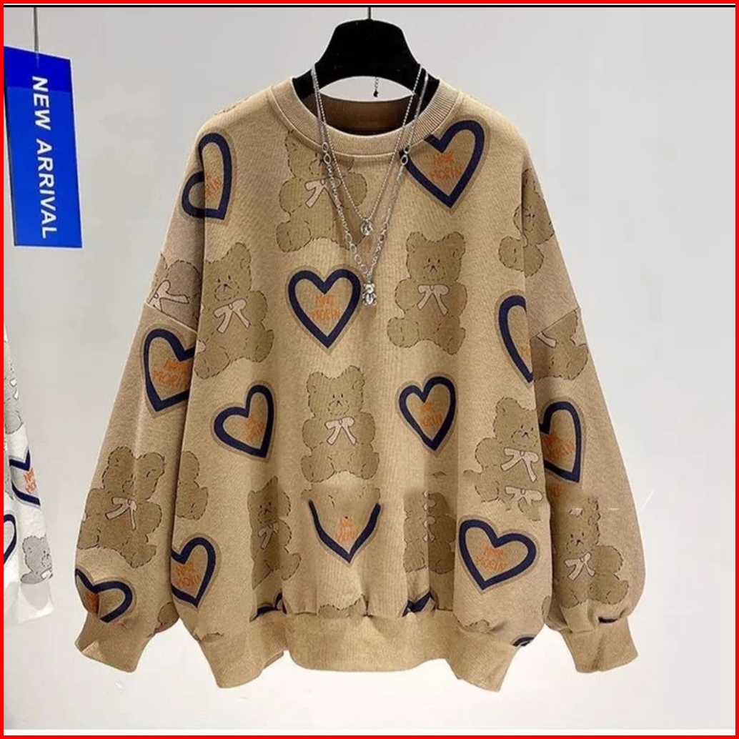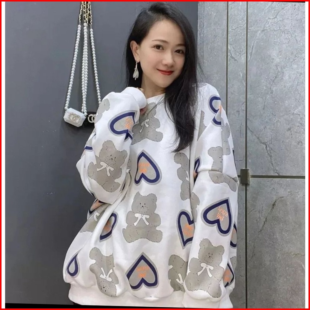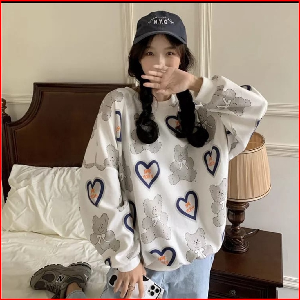 Love Bear Full Print Sweater Wanita Crewneck Sweater Oversize Wanita Korean Style