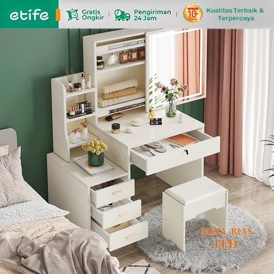 Meja Rias Putih Lampu LED / Meja Rias Kaca Sliding Minimalis / Meja Rias Aesthetic