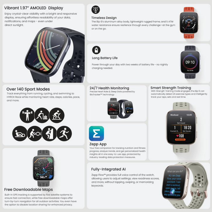 [Star] Amazfit Official Bip 6 Smart Watch 46mm AI Voice Assistance Maps with GPS 140 Sports Modes