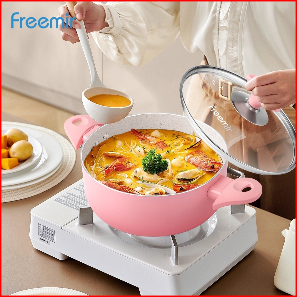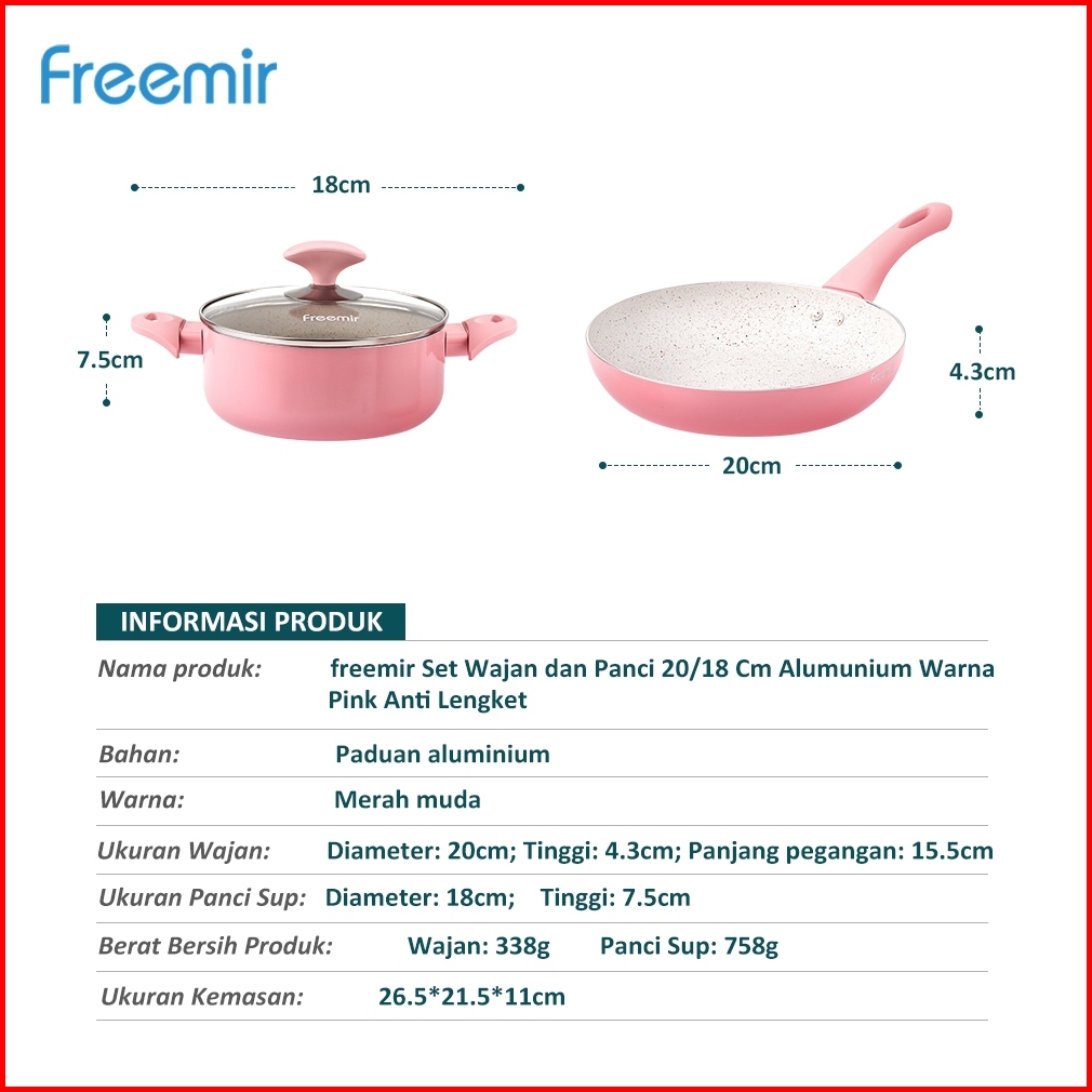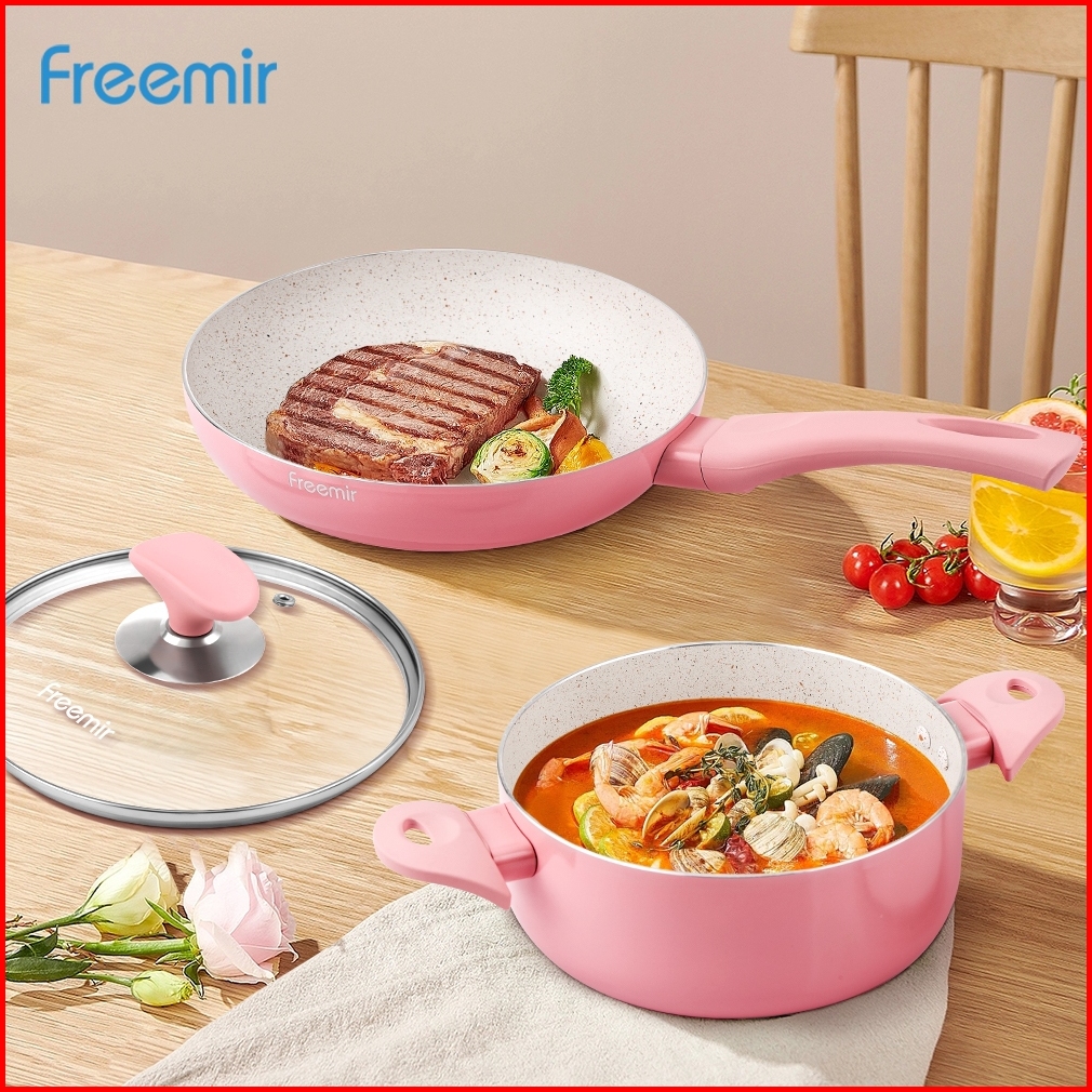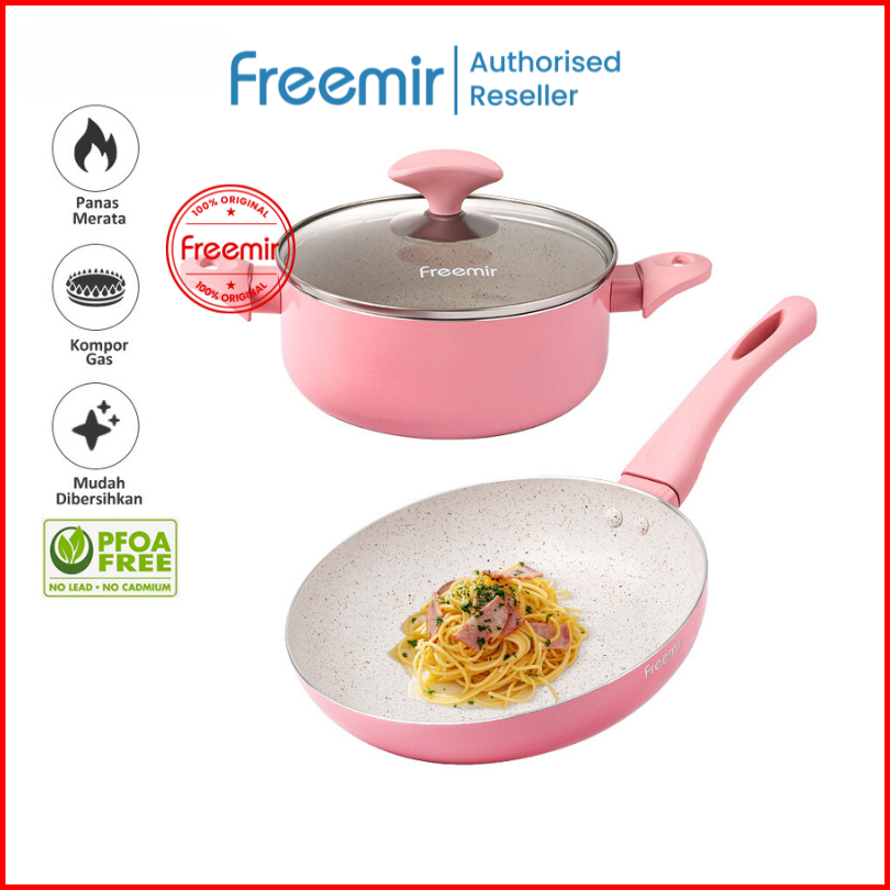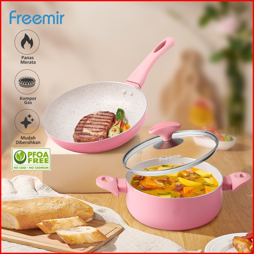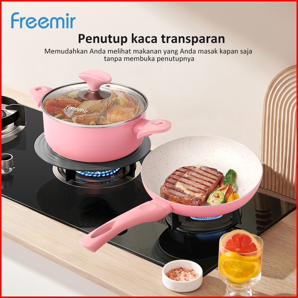 Freemir Wajan Panci Set Anti Lengket Wajan 20 Cm Panci 18 Cm Pink Tutup Kaca Gagang Tahan Panas