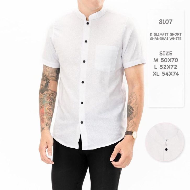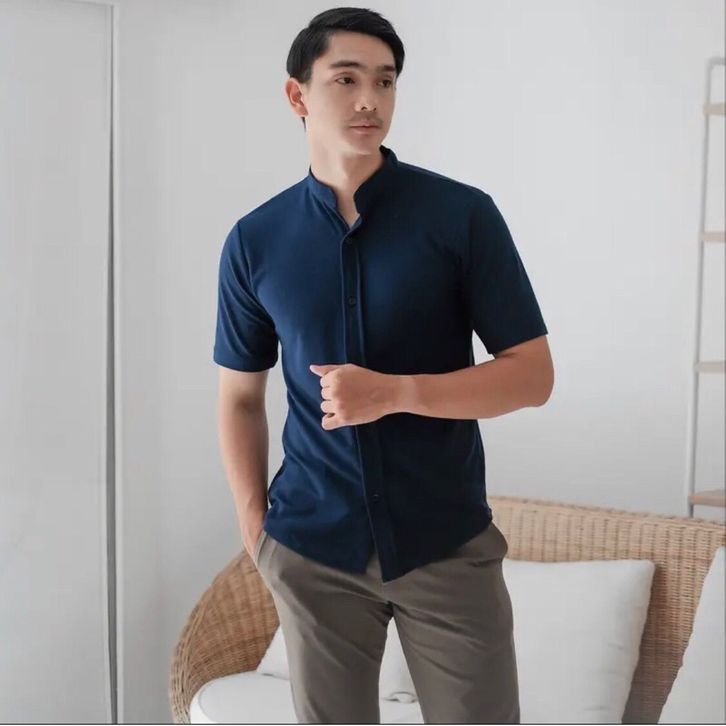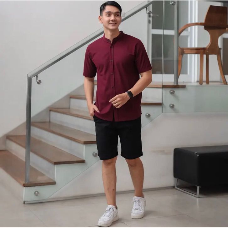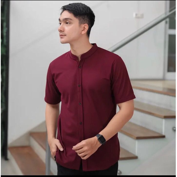 Kemeja Pria Polos Shanghai Maroon Lengan Pendek Kerah Koko Grandad Slimfit
