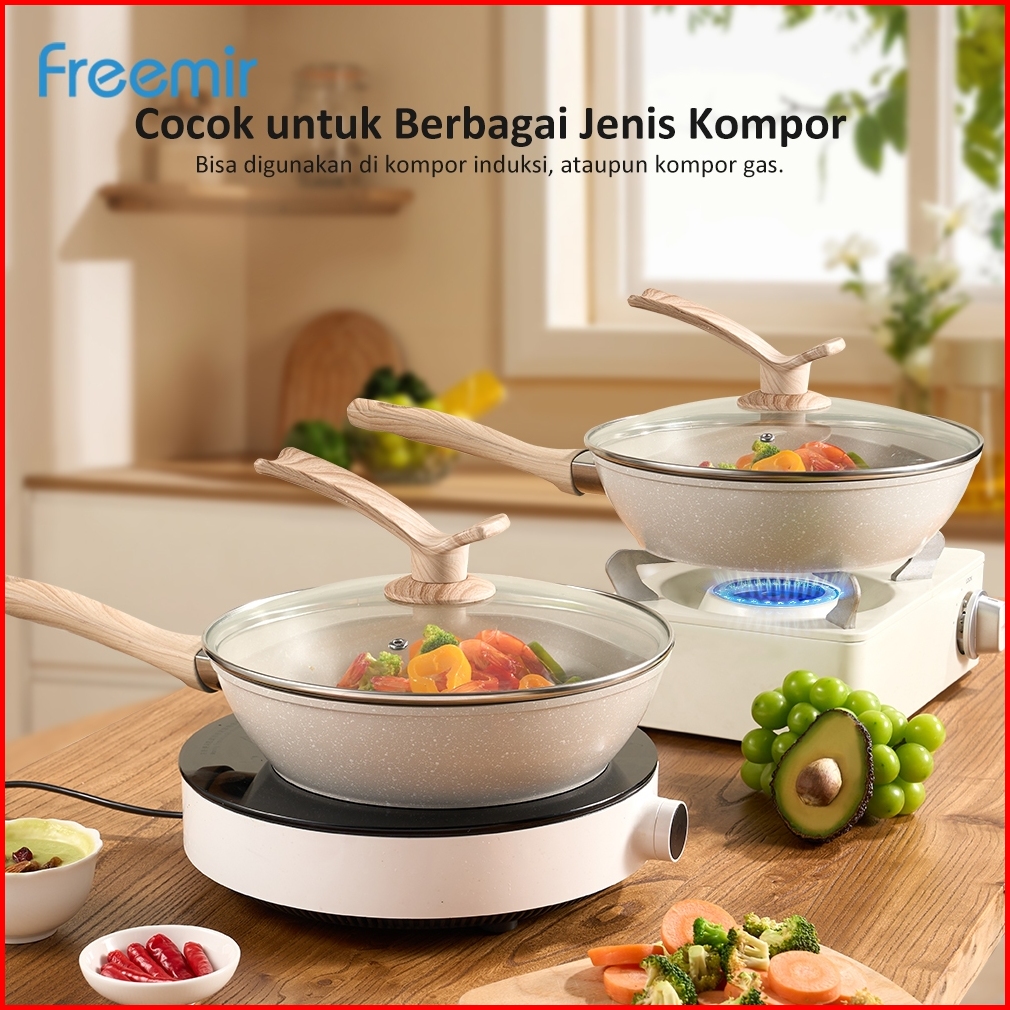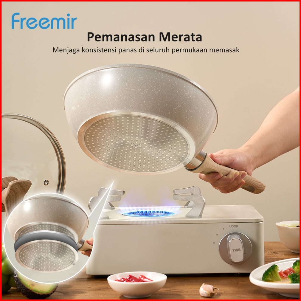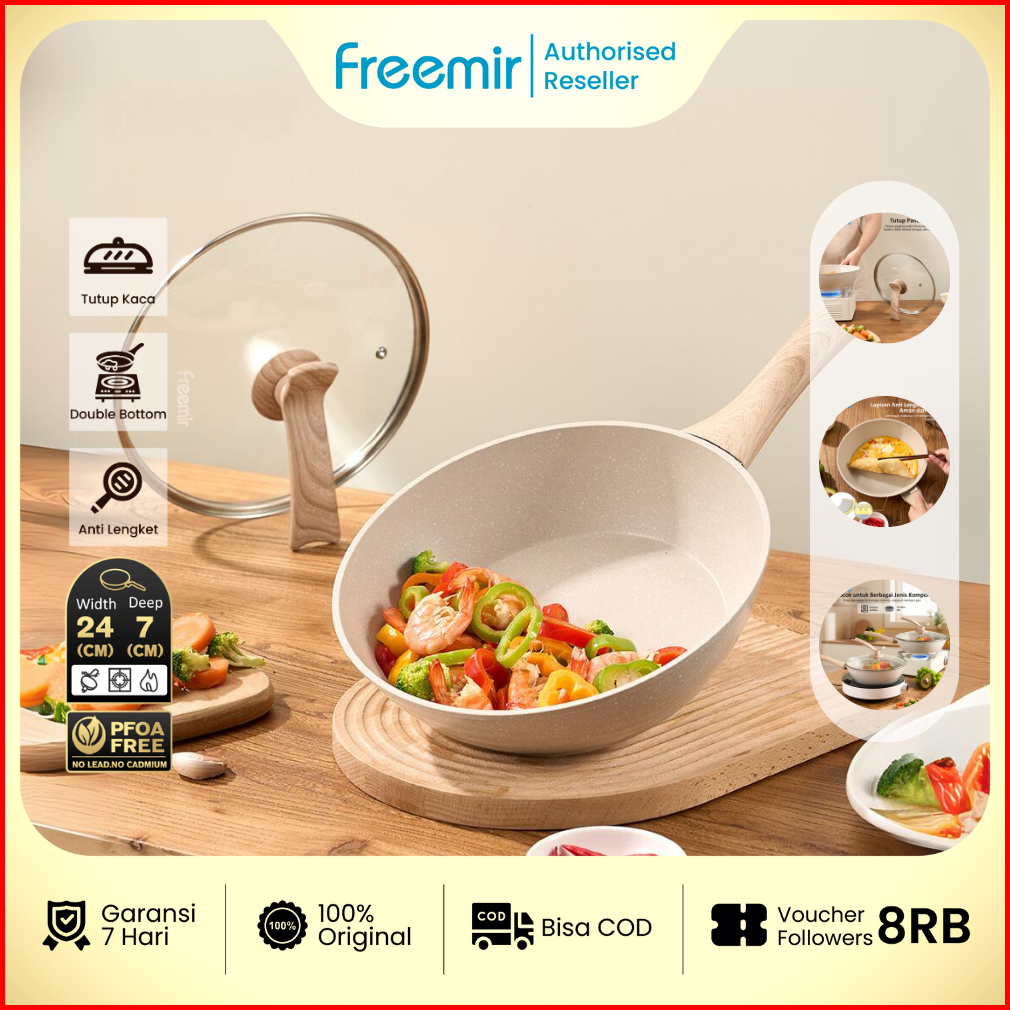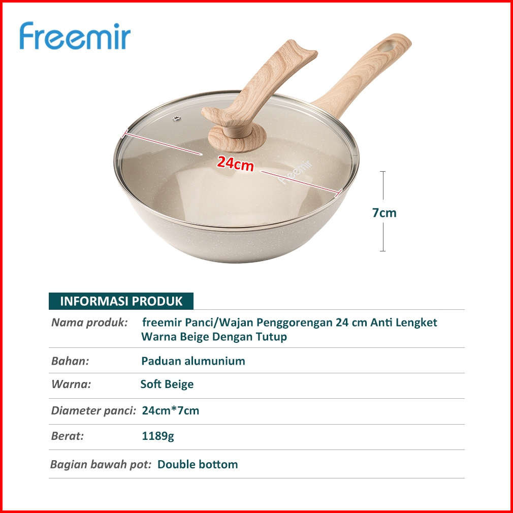 New Double Bottom Freemir Wajan 24 Cm Anti Lengket Tutup Kaca Serbaguna - Beige Krem