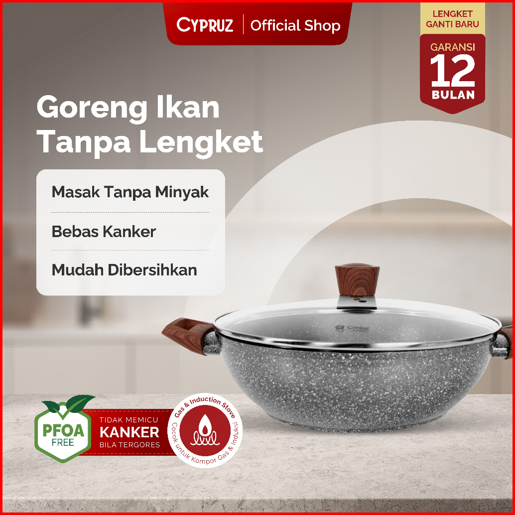 Cypruz Wajan Kuali Anti Lengket Grey Marble Wok Pan Dengan Tutup 24cm