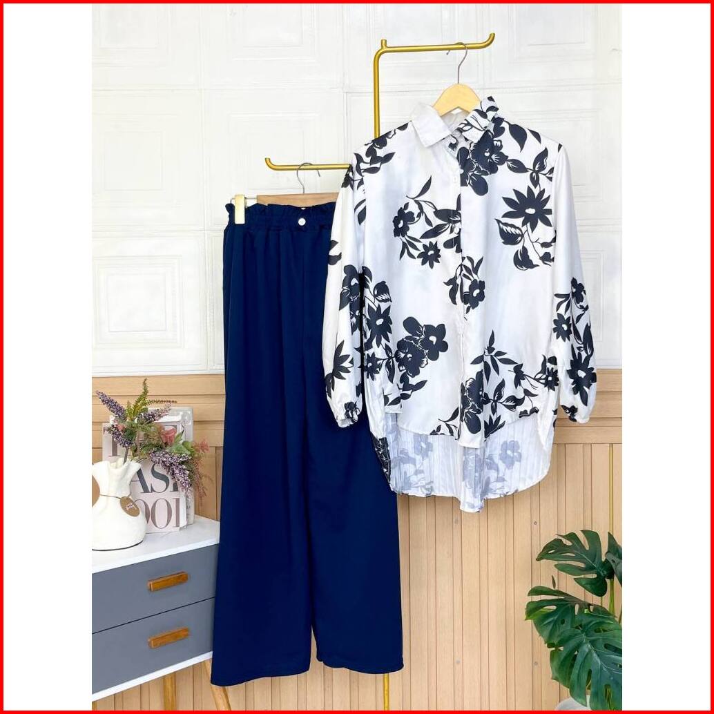 Oneset Munna Plisket Set Wanita Motif Bunga Atasan Celana