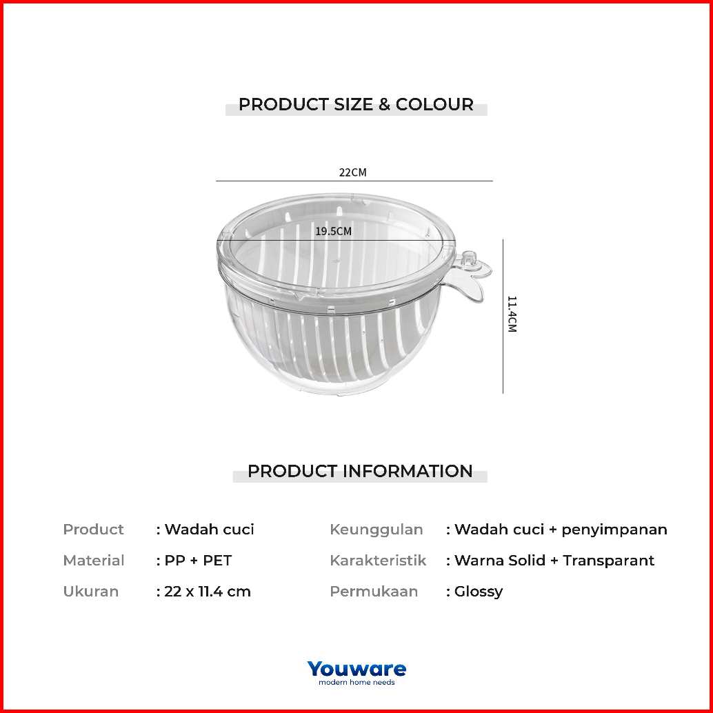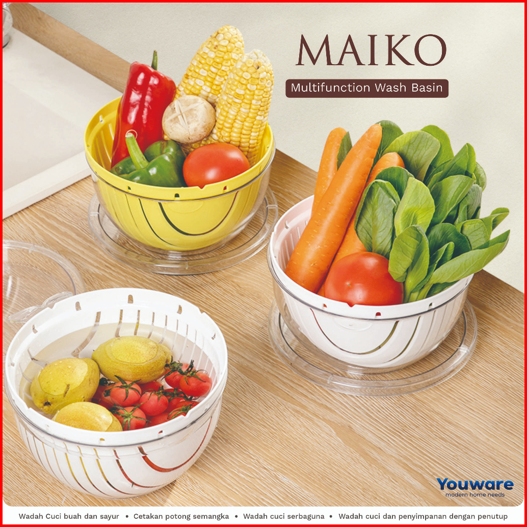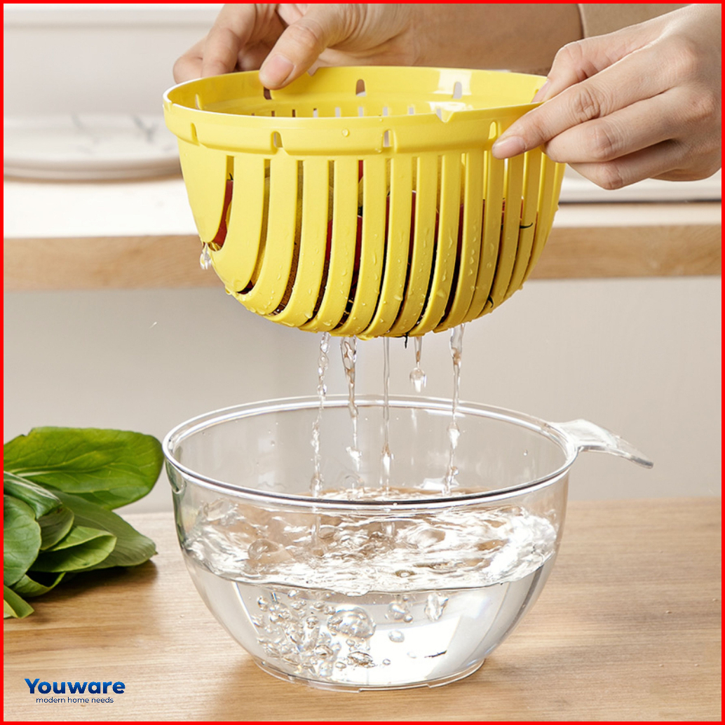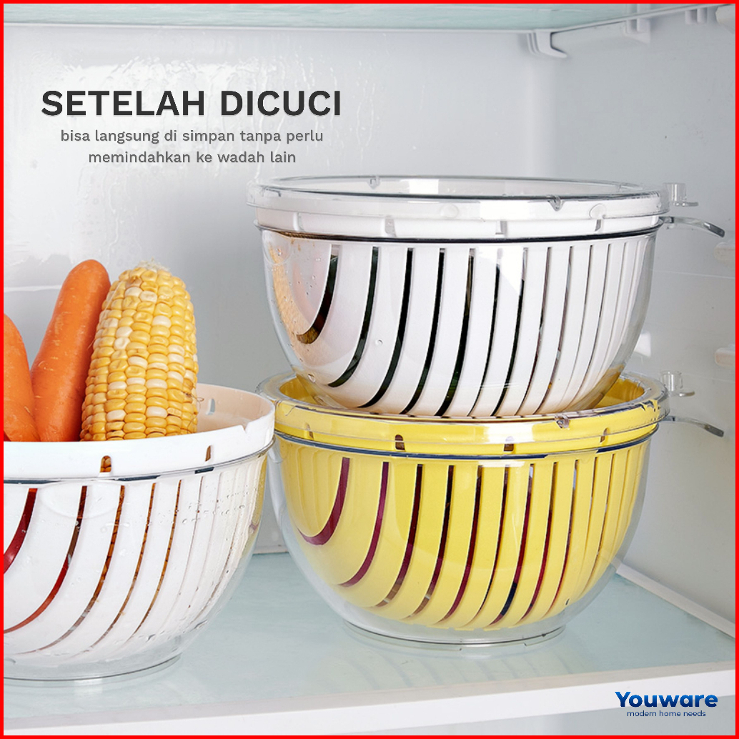 Youware - Maiko Wadah Pengering Saringan Cuci Buah Sayuran Makanan Baskom 2 In 1 Penganduk