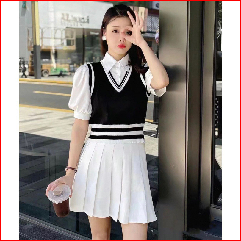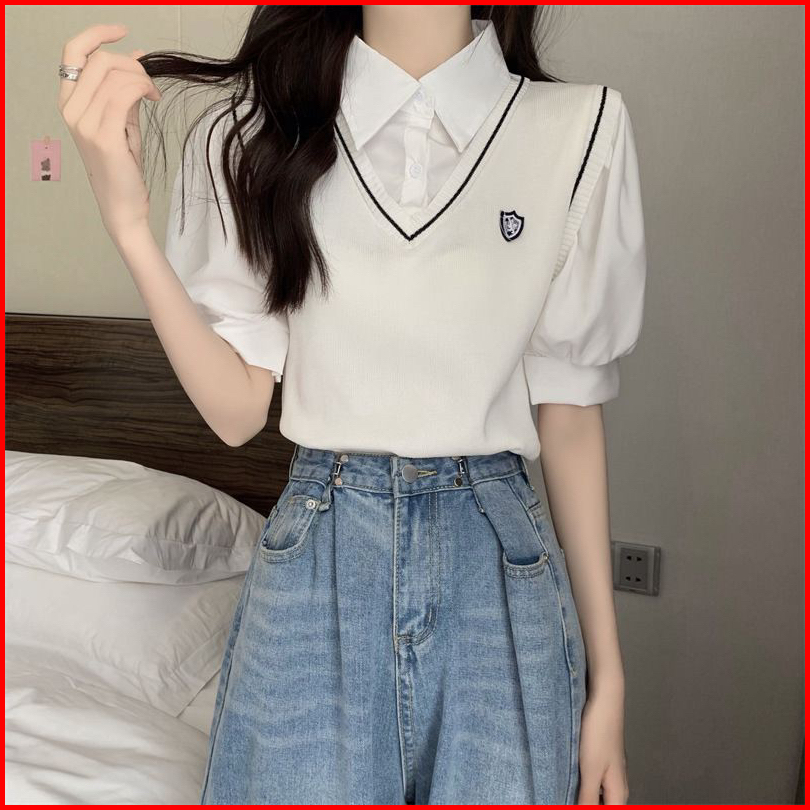 Blouse Atasan Areum Top Blouse Set Vest Shirt Polo Rompi Collar Kemeja Kerah Knit Rajut Korean Style Lengan Pendek Shirt