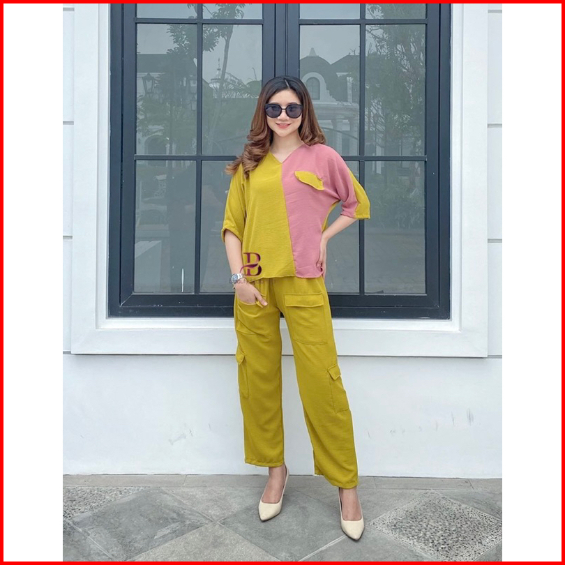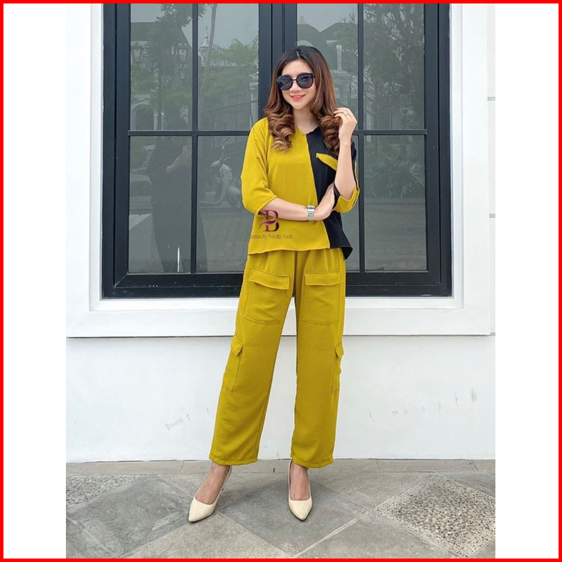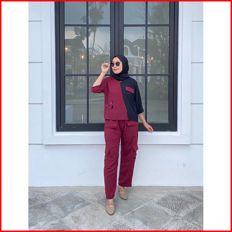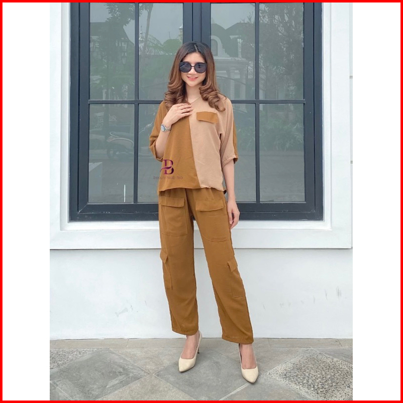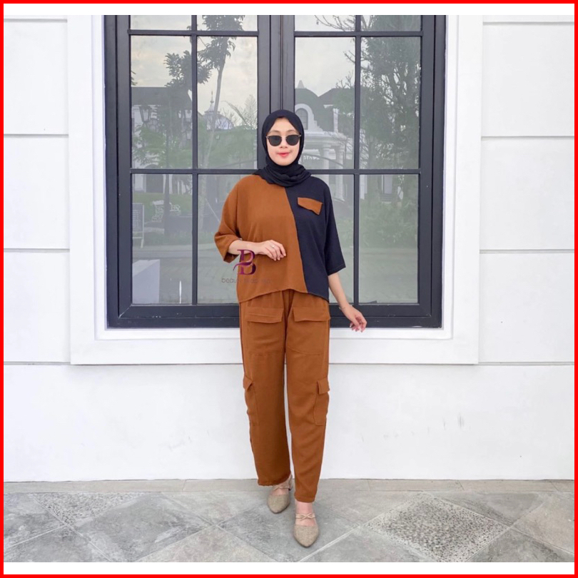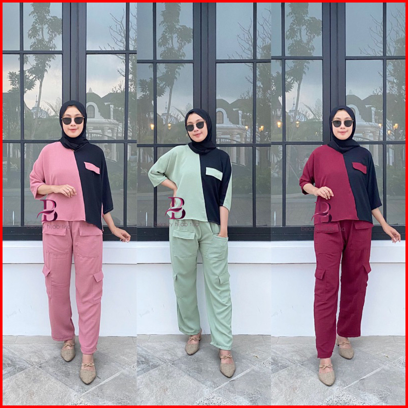 Beautyhijab - Azizah Setelan Celana Cargo Wanita Kekinian Baju One Set Crinkle Airflow Jumbo