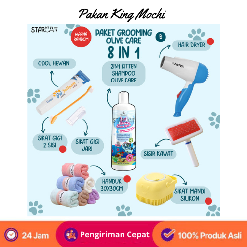 Paket Grooming 2in1 SC 8in1 Olive Care Kitten Shampoo Kucing Bulu Kulit Mulut Anti Jamur Kutu Handuk