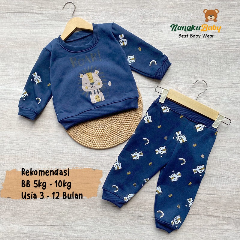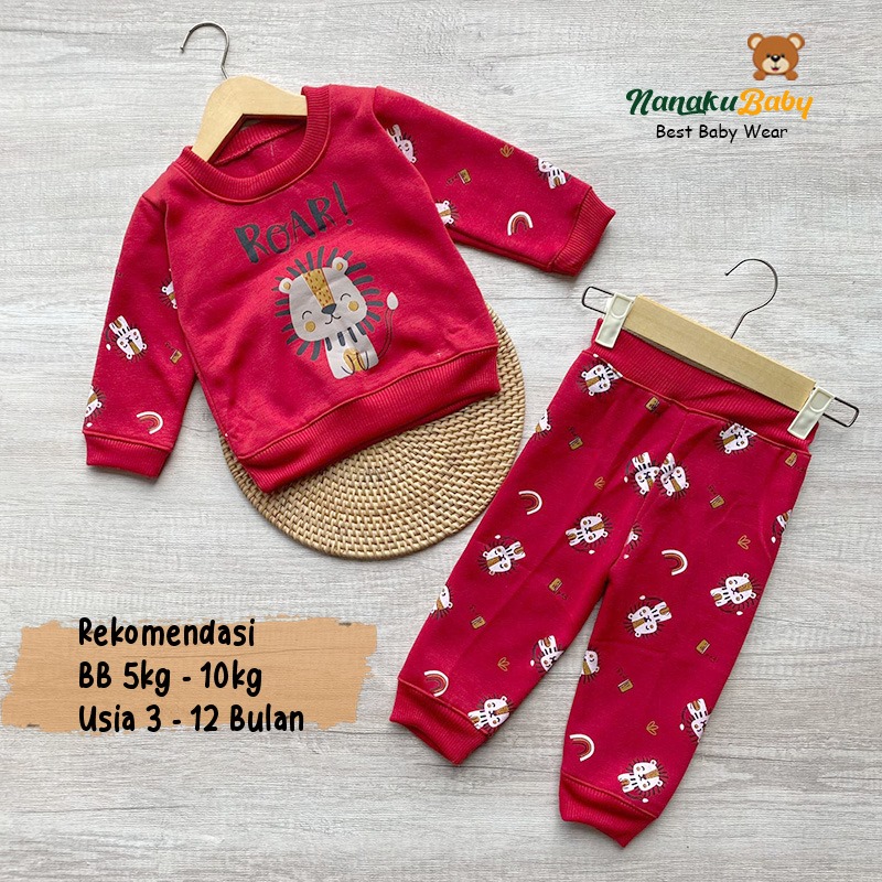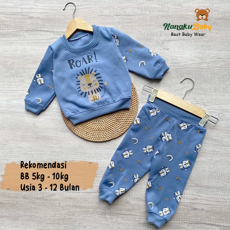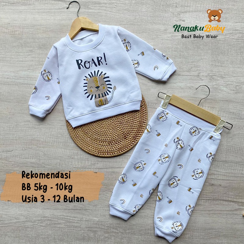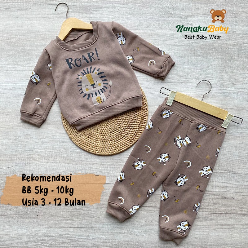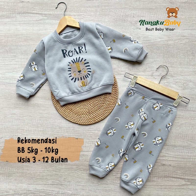 Nanaku Baby - Setelan Baju Sweater Celana Joger Bayi Bahan Katun Fleece Usia 3-12 Bulan Motif Singa Roar