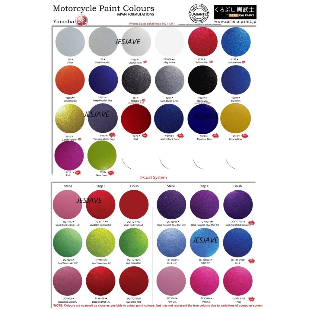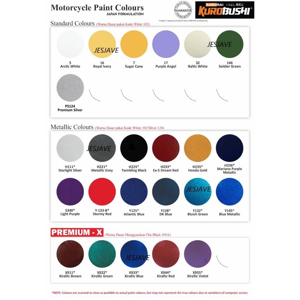 Hitam (109) , Hitam Doff (109A) , Putih (102), Clear (128) , Clear Doff (128A) , Silvr (124), Grey (104) , Signal Red (23) , Gld (123), Blue (312) , Tivoli Blue (9) , Metalik Black 1139**, Army Green (142) , UCH210* Grey Epoxy, UCY113*Silvr Epoxy , SparklingSilver 1701, SparklingGold 1123** , Super Green 1144**, H. Matte Grey - H749 , Y. Matte Grey Y747*, Purplish Blue-Y3973* , Black Mio - Y1222* , Silky White Y31008** , Pearl White - H196**, Pearl White - K420** , Magnesium EP876*, Clear - K1K (300ml) , Brilliant Red Y138*, Moviestar Blue-Y688* , Yamaha Red 1108**, Samurai Maroon (38) , Scopy Light H2020**, Scopy Brown H391** , Silver Metallic Y3*, Marine Blue Y139* , Candy Yellow Y016*, Stabilo Pink 53** , Stabilo Green 54**, Stabilo Orange 55** , Stabilo Yellow 56**, Stabilo Red 57** , KPP Primer (300ml), Hi-Temp Black 300ml , Hi-Temp Silver 300ml, Paint Remover PR500* , STR600-300ml, Chrome Yellow (108) , Pink (113) , Tosca Greeen (322), Dark BluishGrey Y367 , Arctic White (5), Baltic White (32) , 106 LIGHT GREY, 8540 CLEAR, 371 LIGHT BLUE , Y3505** VIVID ORANGE, 116 DEEP BLUE , 164 MIKROLET BLUE, Royal Ivory (16) , 1103**CTM HONDA BLUE, 115 LIGHT SCARLET , 149 TAXI YELLOW