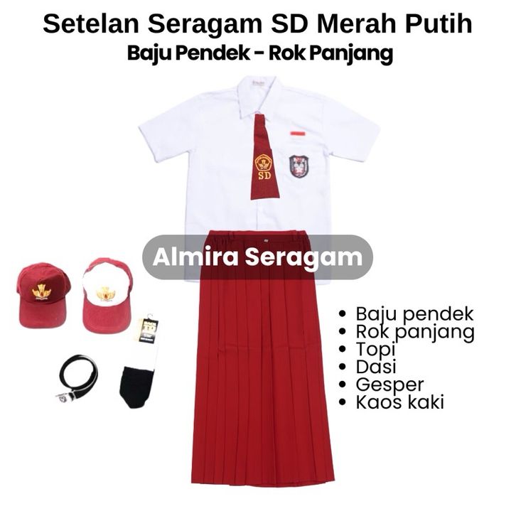 Setelan Super Lengkap Seragam Sekolah SD Kemeja Baju Pendek & Rok Panjang Perempuan Cewek Seragam Merah Putih Perempuan
