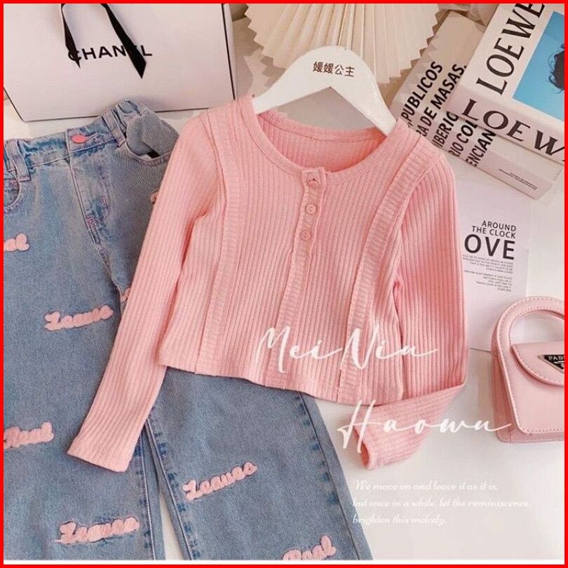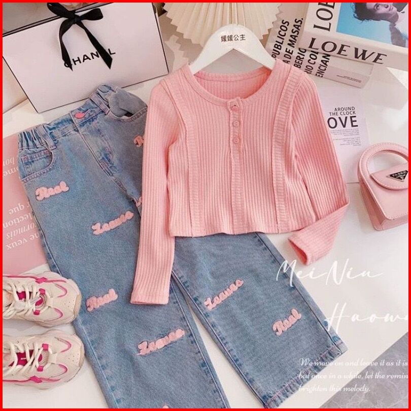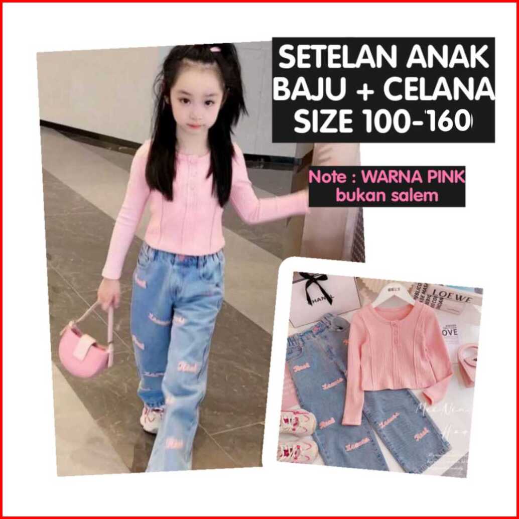 Loli-jkt Bs- 516 Setelan Anak Pink Kancing Celana Jeans Bordir Size 100-160