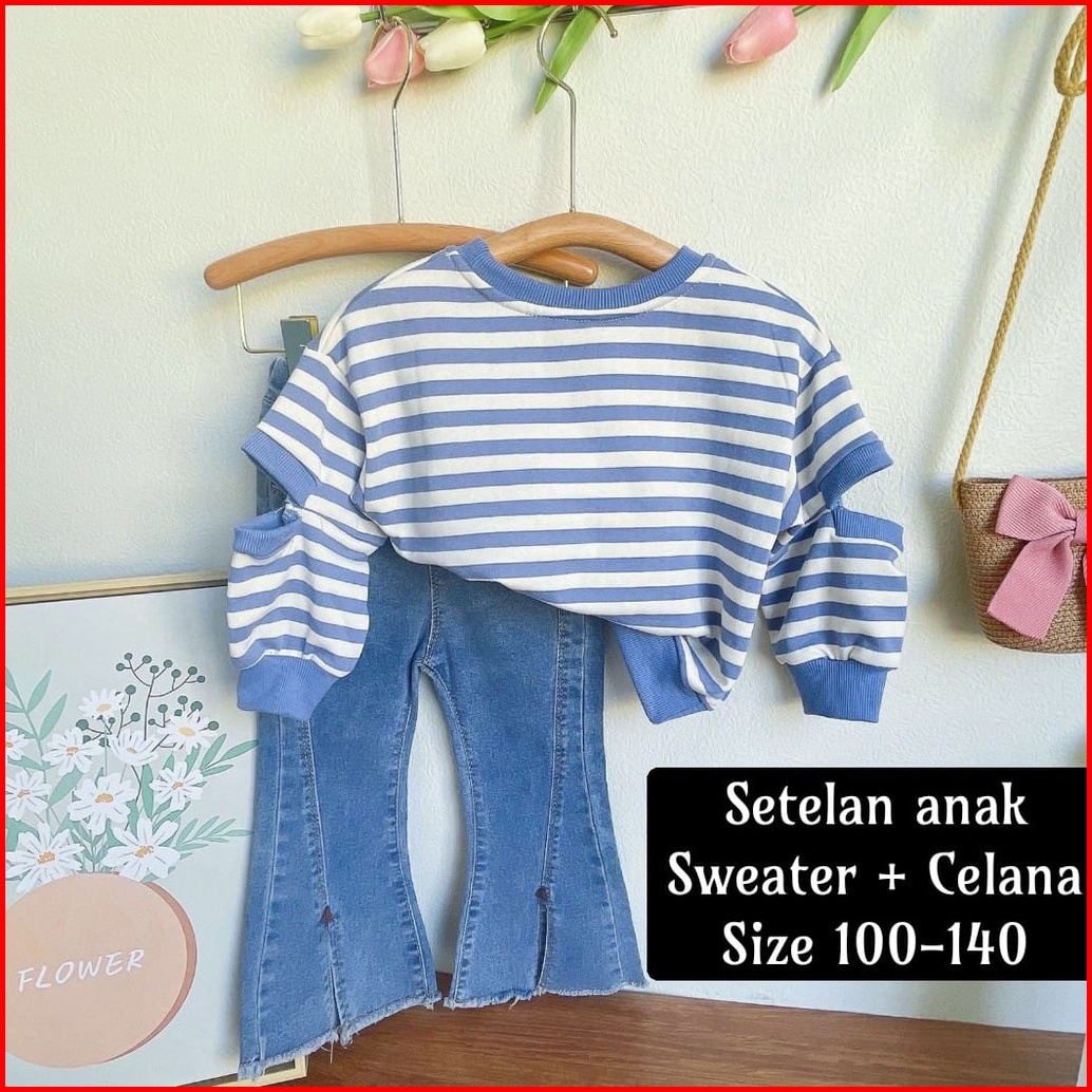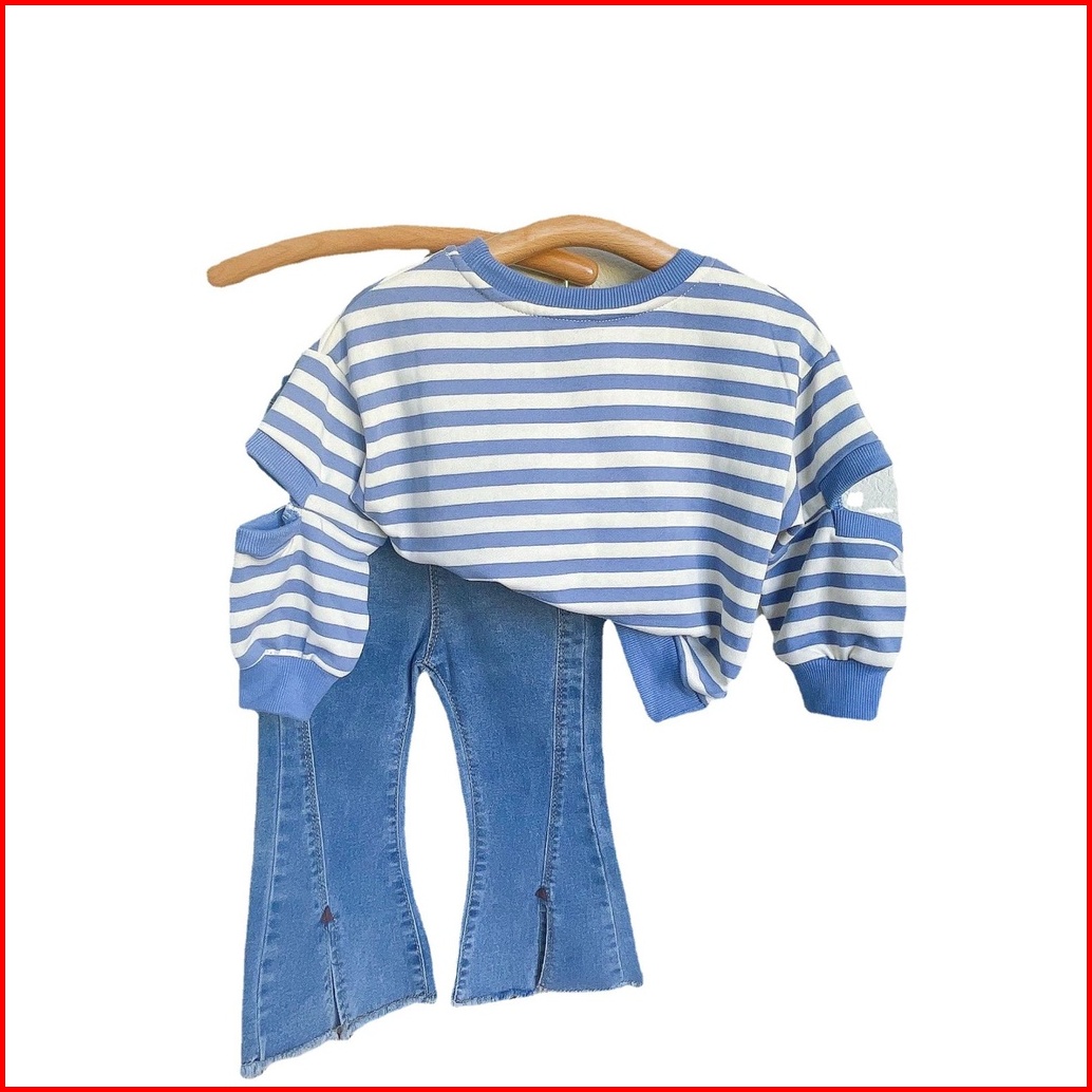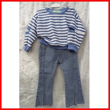 Loli-jkt Bs-350 Setelan Anak Cewek Sweater Garis Biru Celana Jeans Size 100-140