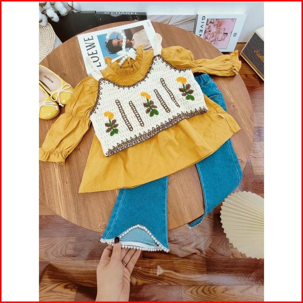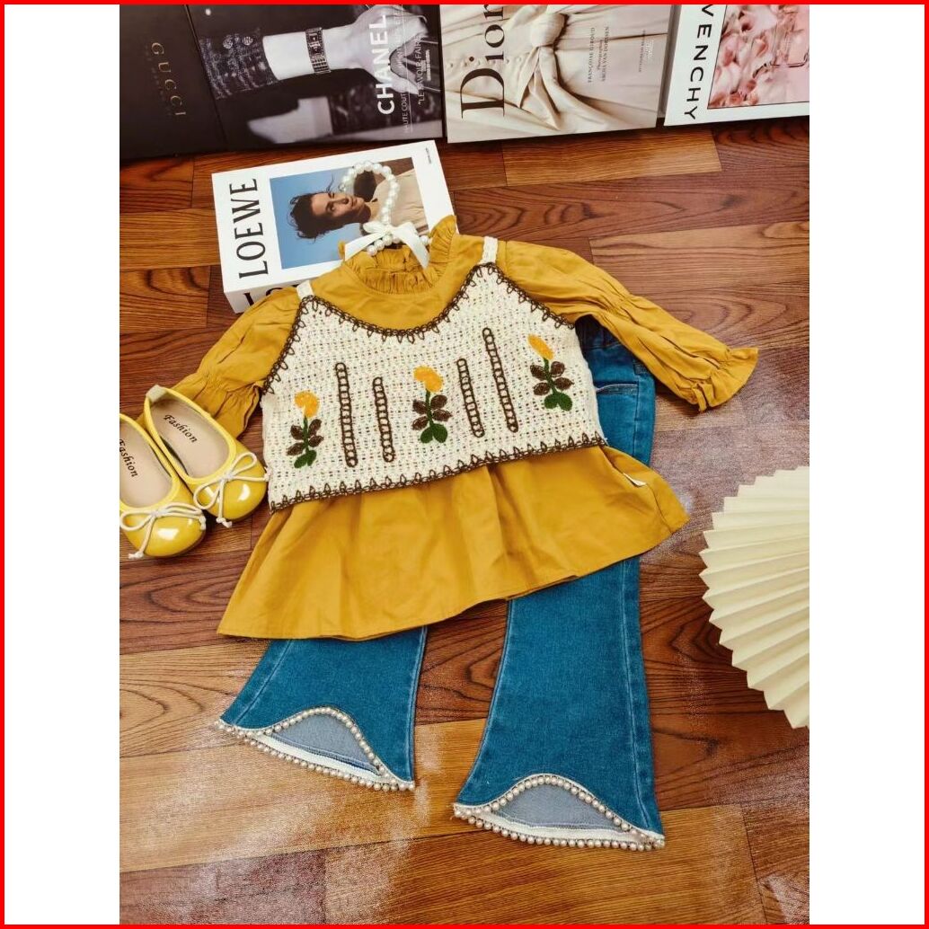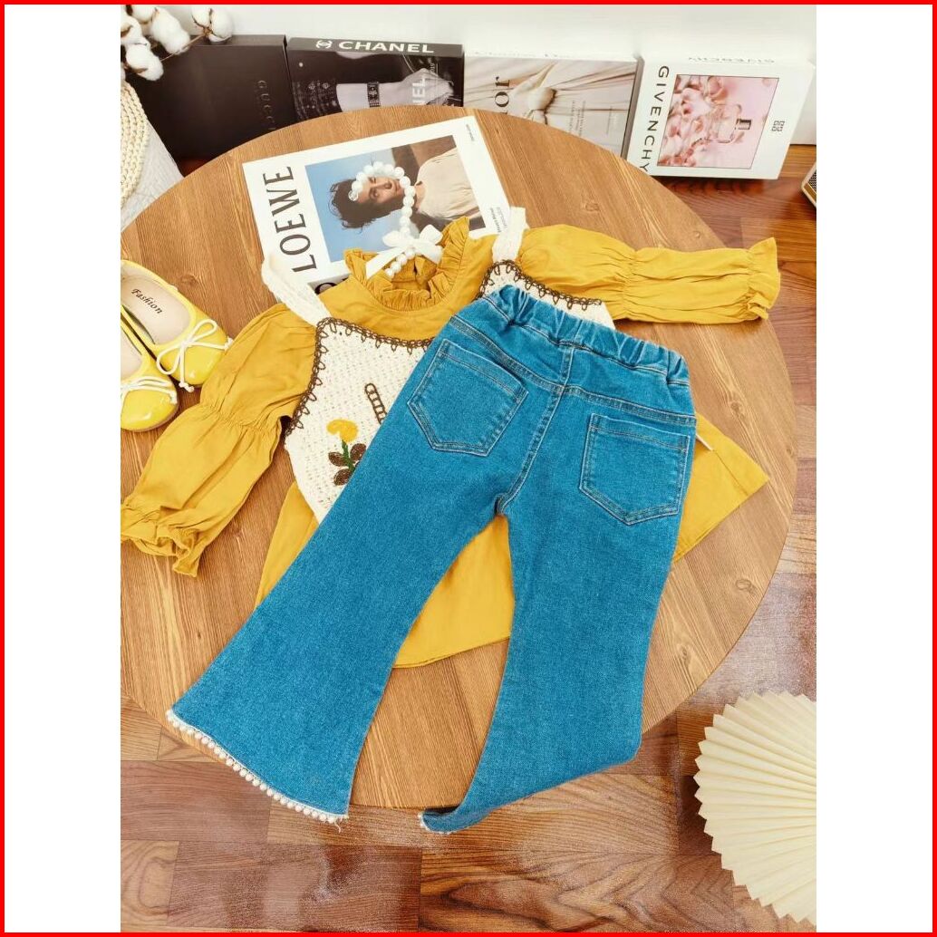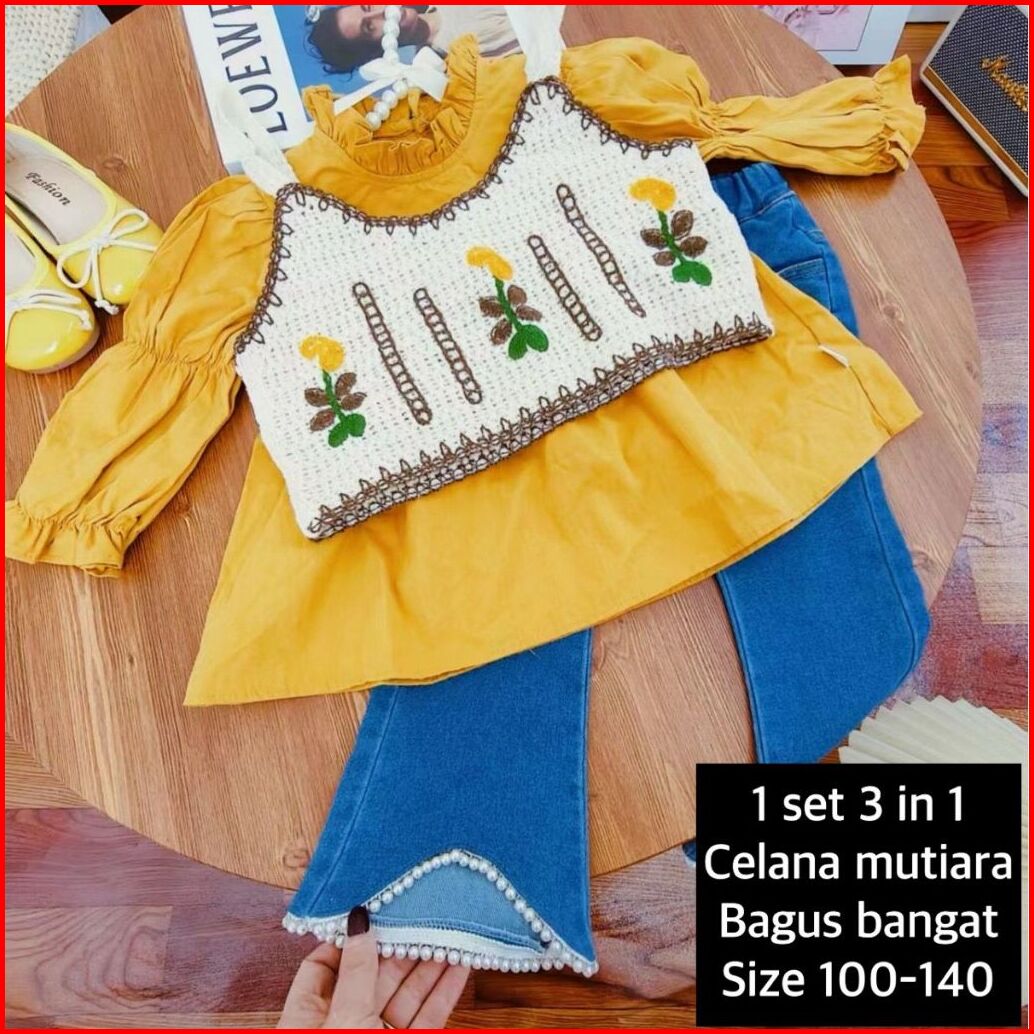 Loli-jkt Bs- 545 Setelan Anak 3n1 Rompi Bordir Sulam Celana Jeans Size 100-140