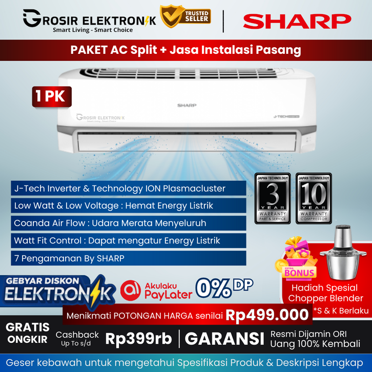 [ +PASANG ] - AC 1.5PK Hemat Listrik Plasmacluster SAYONARA [ SHARP AH-UHL-0.5pk-2pk ] - ac sharp 1pk - A1PK - STGE