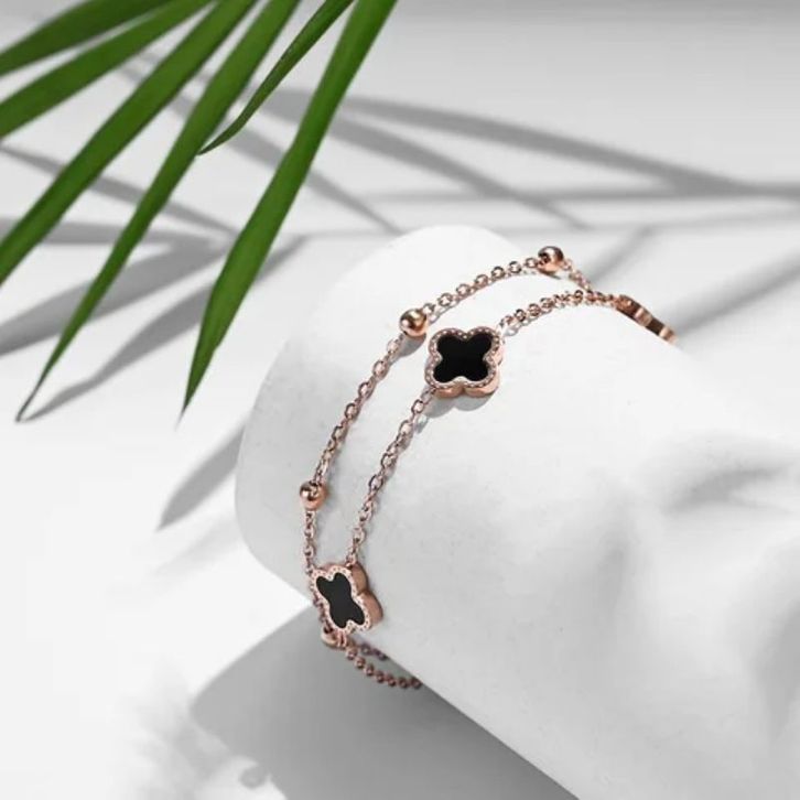 GELANG TITANIUM MATA HITAM FASHION CLOVER 2 LAYER GELANG WANITA KOREA