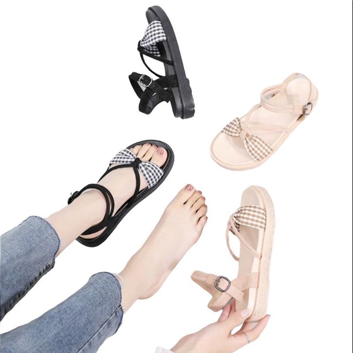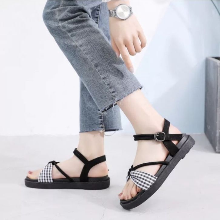 Sandal Tali Wanita Terbaru Kanvas Hitam / Sendal Wedges Wanita Viral Kekinian / Sandal Cewek Abg Terlaris