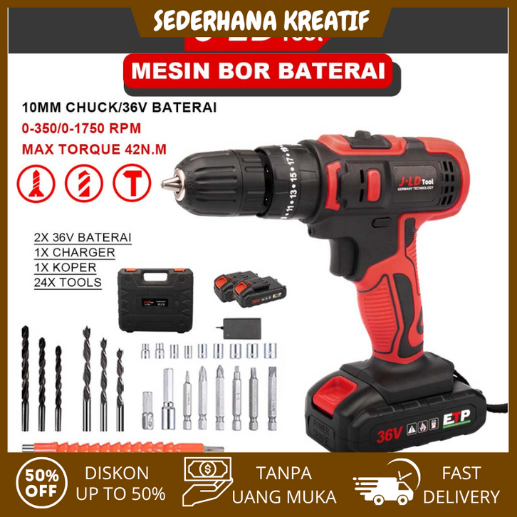 JLD 36Vf mesin bor impact bor listrik baterai cas 2 baterai set 36v 2