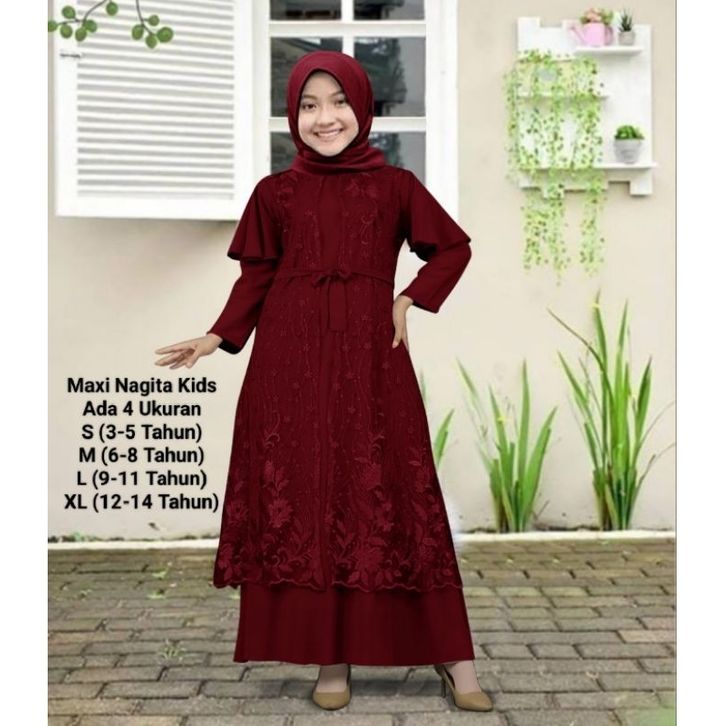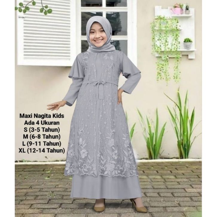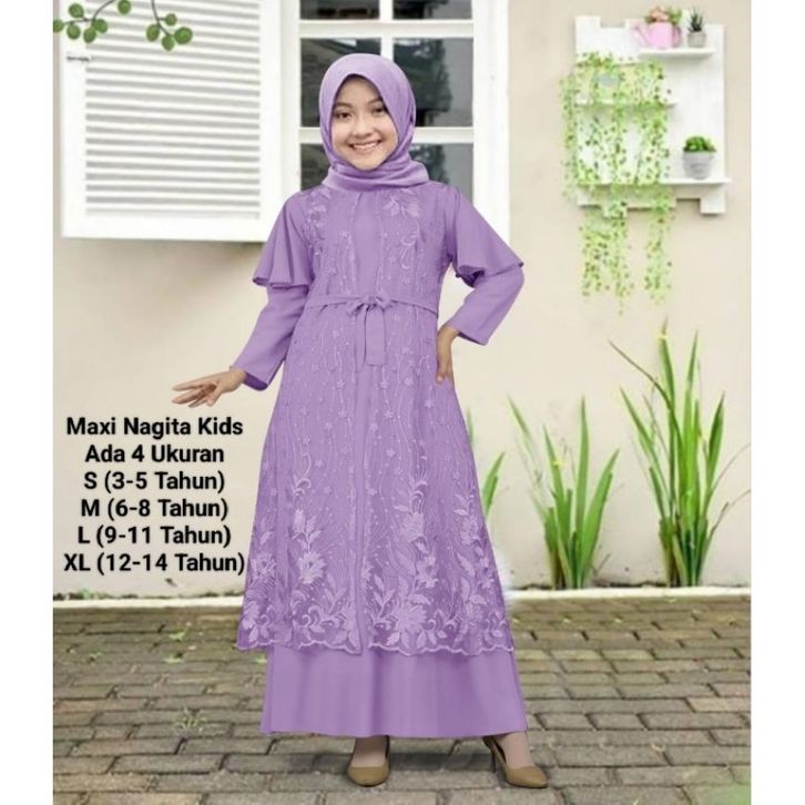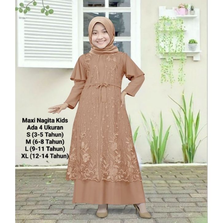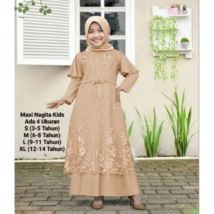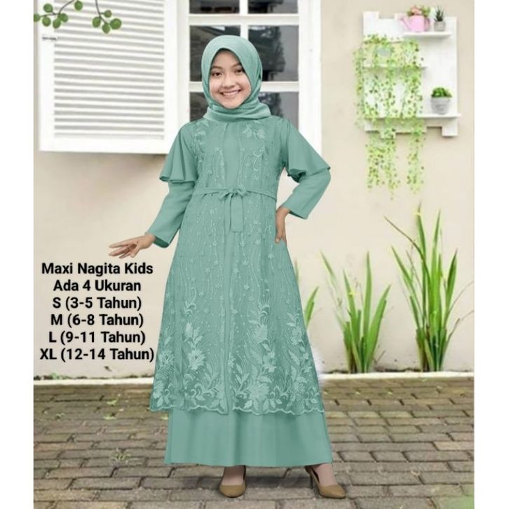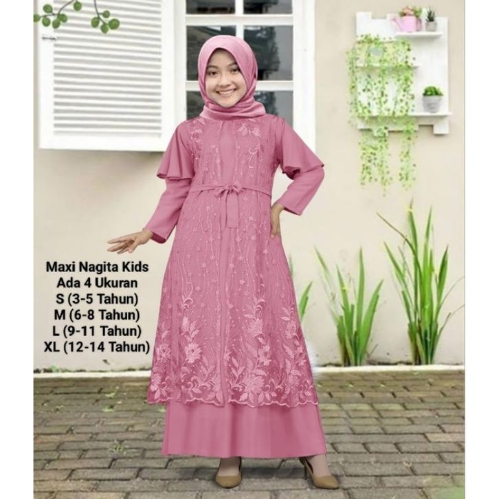 Gamis Anak Cewek Pakaian Muslim Pesantren Remaja Model Maxi Nagita Bahan Moscrepe Mix Brokat Ukuran 3-14Th