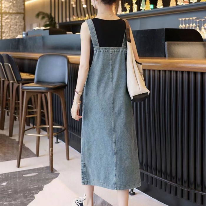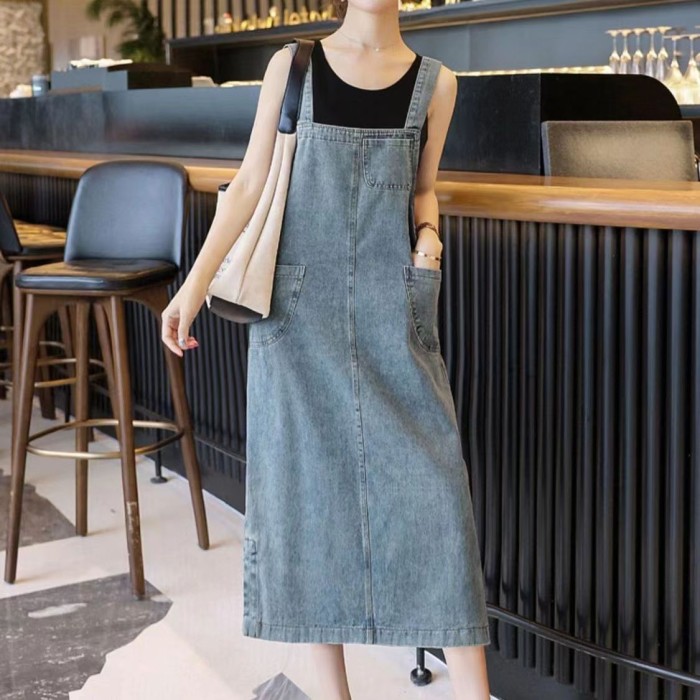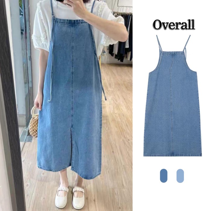 OVERALL JEANS PANJANG WANITA ROK SUSPENDED MIDI DRESS ROK JEANS WANITA - BIRU MUDA, L