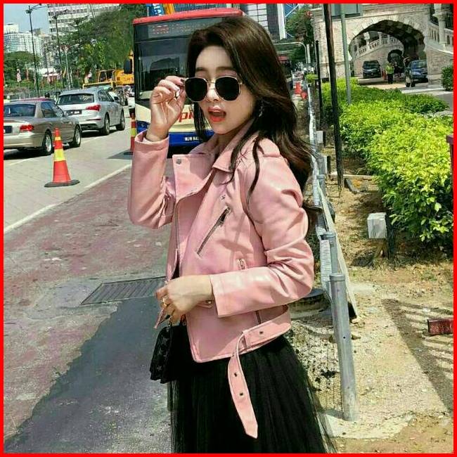 Jaket Kulit Wanita Crop Pink Baby Sintetis Premium