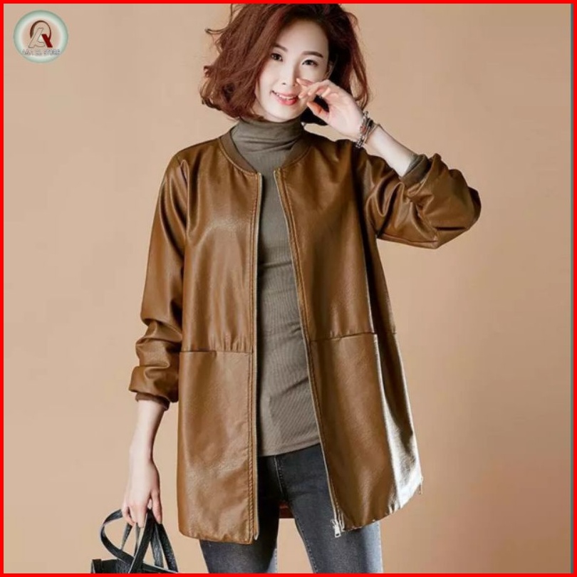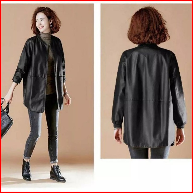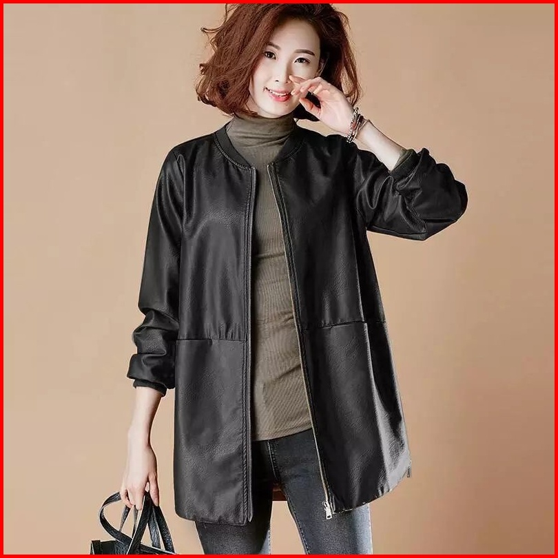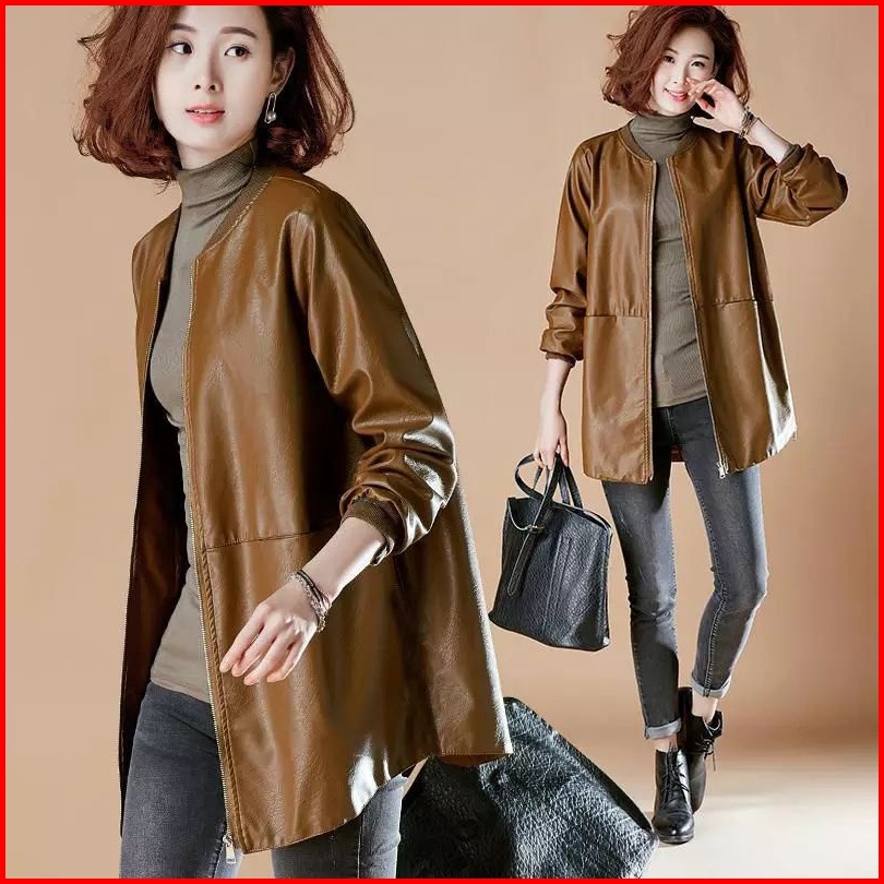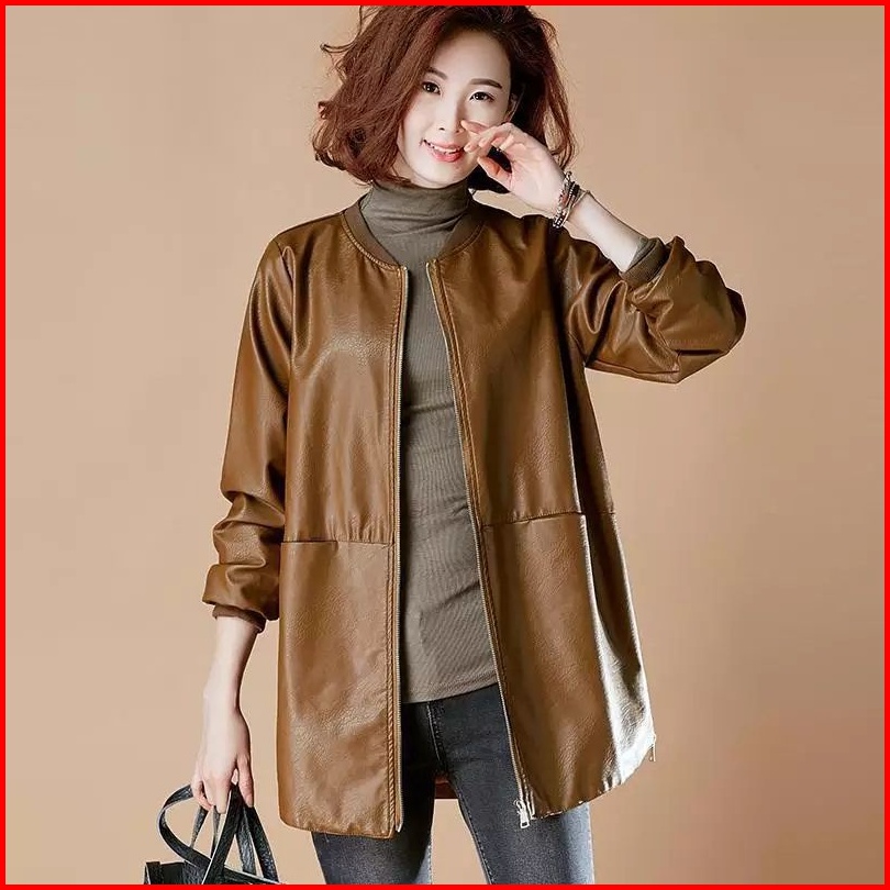 Jaket Kulit Sintetis Longgar Wanita 2025 Model Mantel Dasar Lengan Panjang Biker Wanita