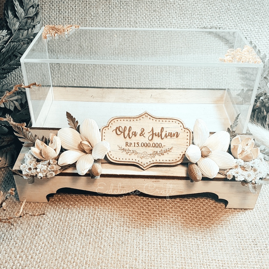 Kotak Uang Mahar Seserahan Pernikahan Kayu Ukiran Akrilik Rustic Free Name