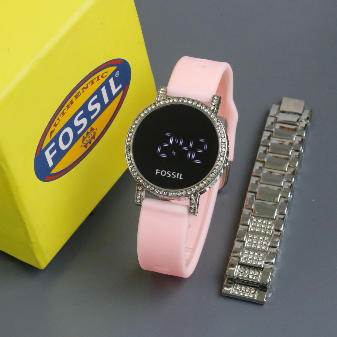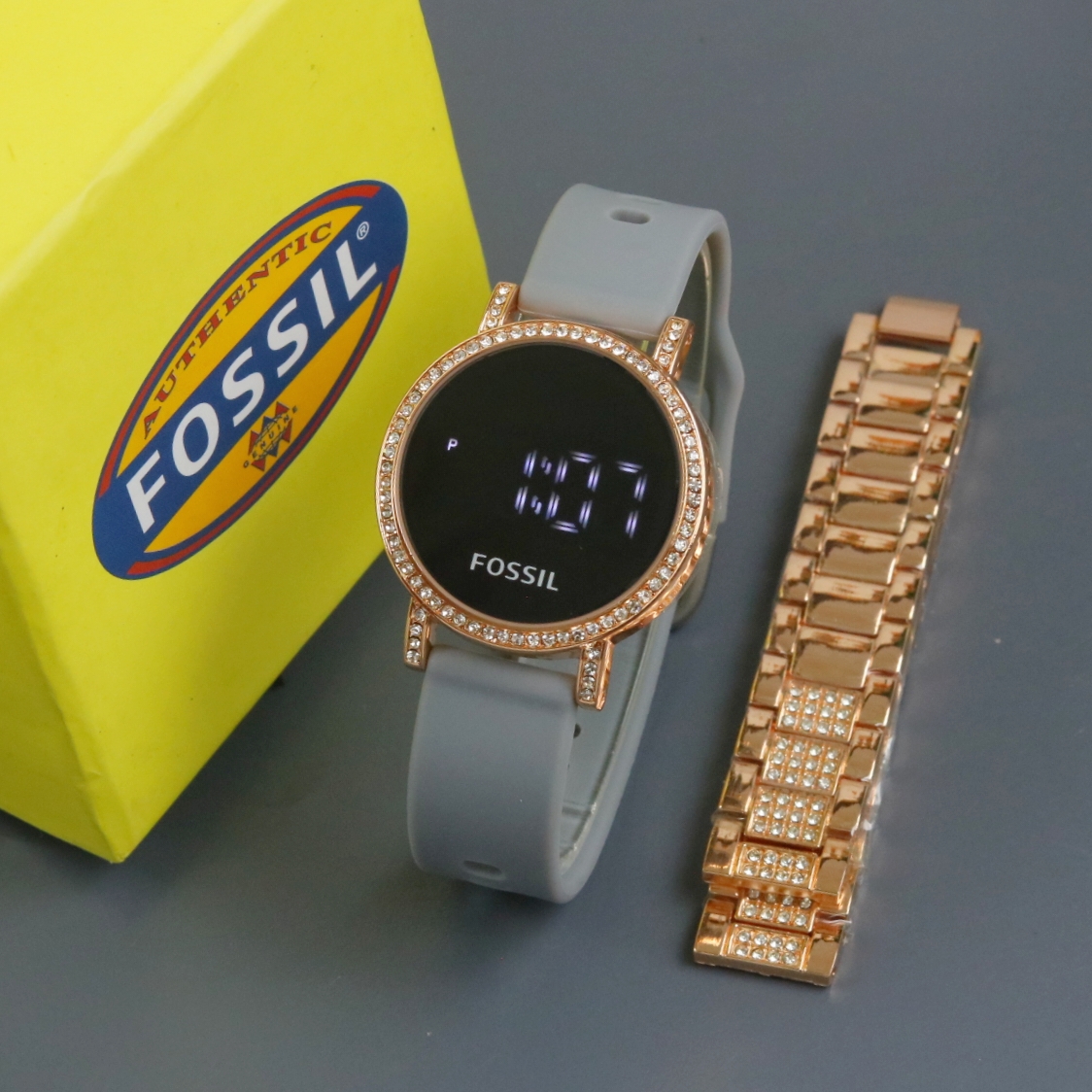 Promo - Jam Tangan Wanita FOSSIL F9657Y Led Touch Screen Tali Rubber Free Tali Rantai & Box